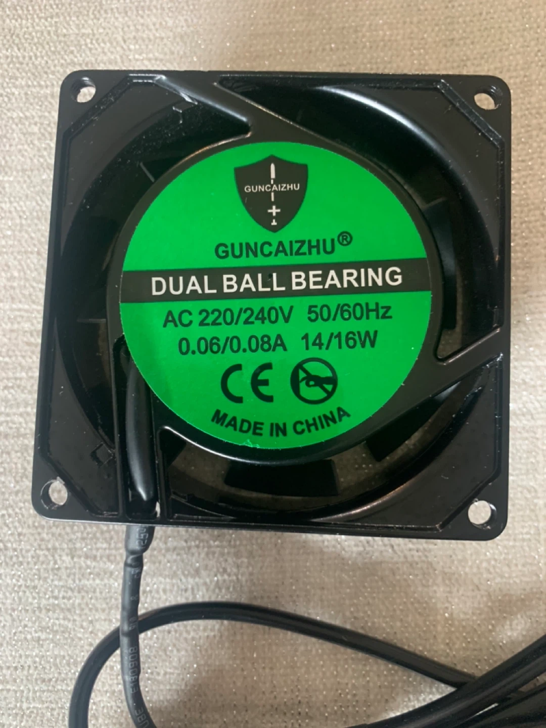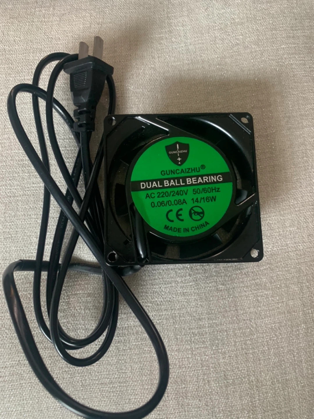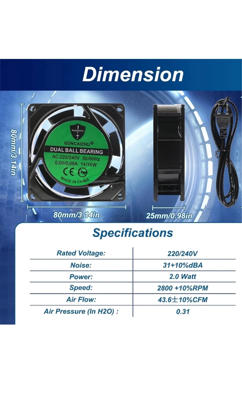 GUNCAIZHU dual ball bearing fan. AC 220-240V, 50/60Hz, 0.06/0.08A, 14/16W. Dimensions are 80mm x 80mm x 25mm. Includes power cord.