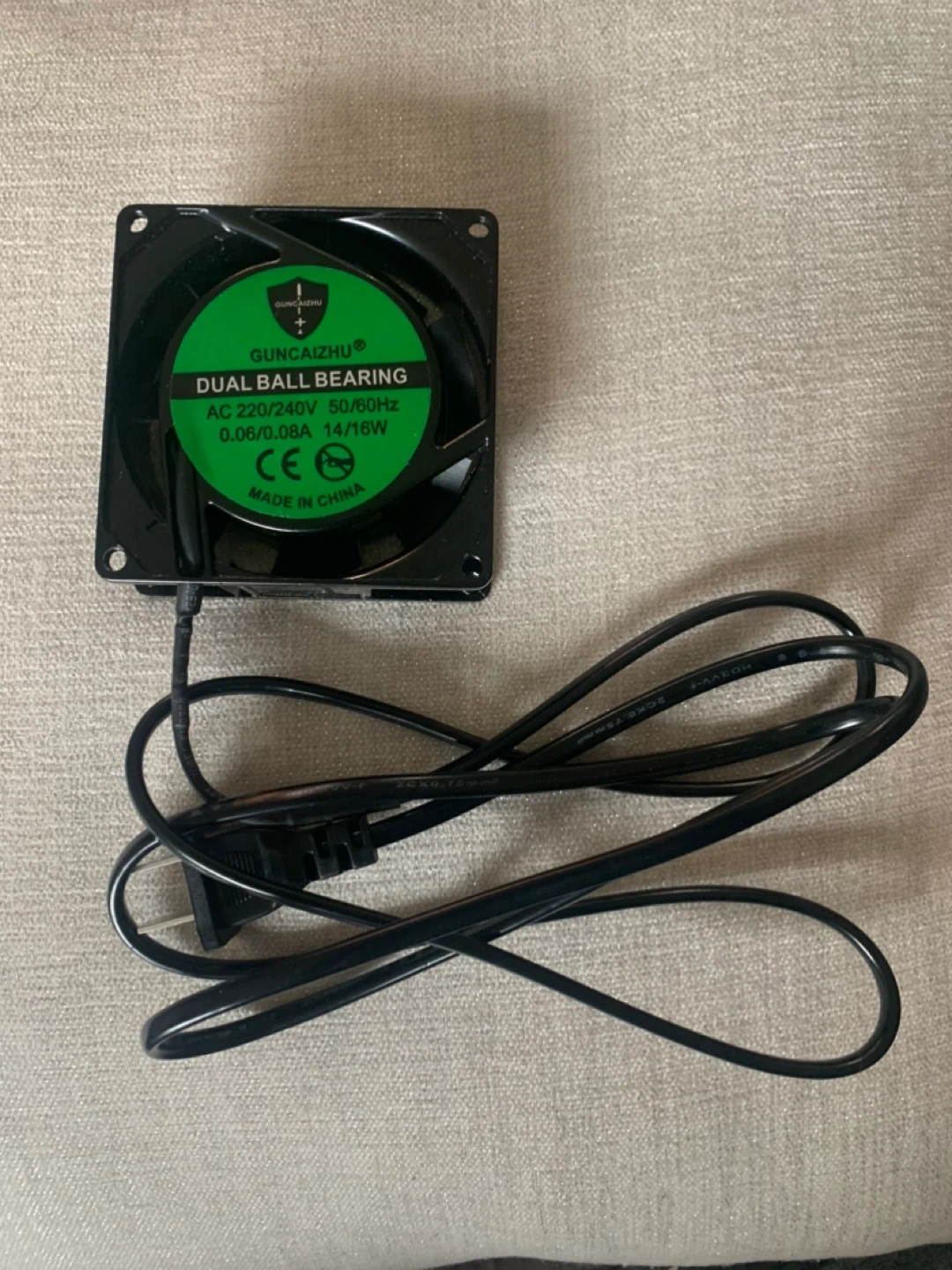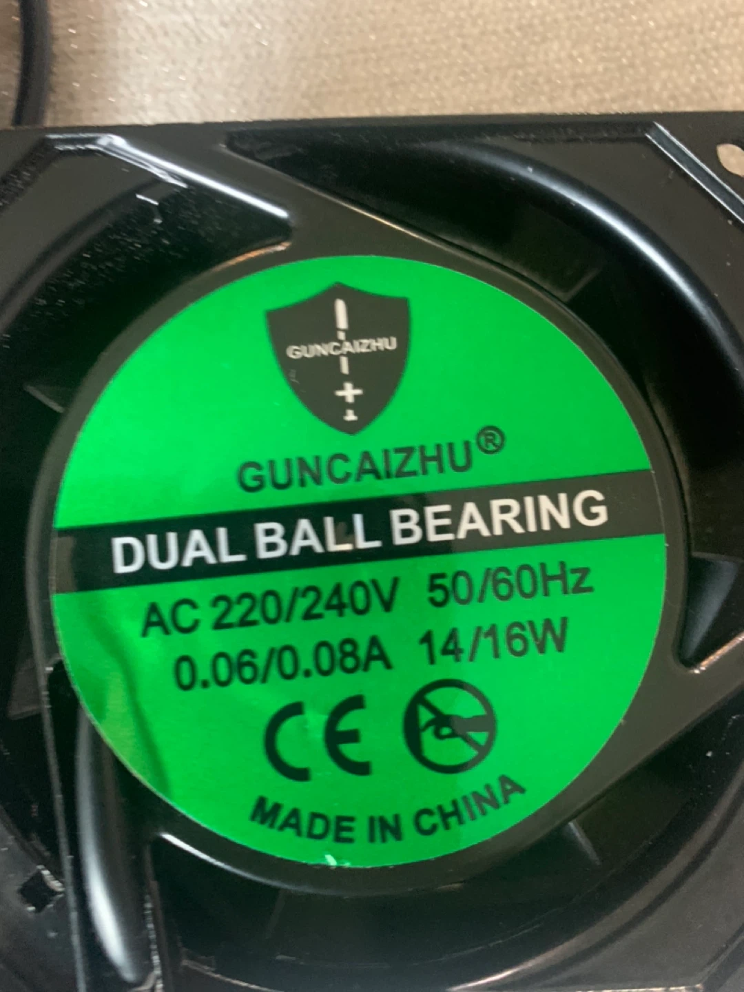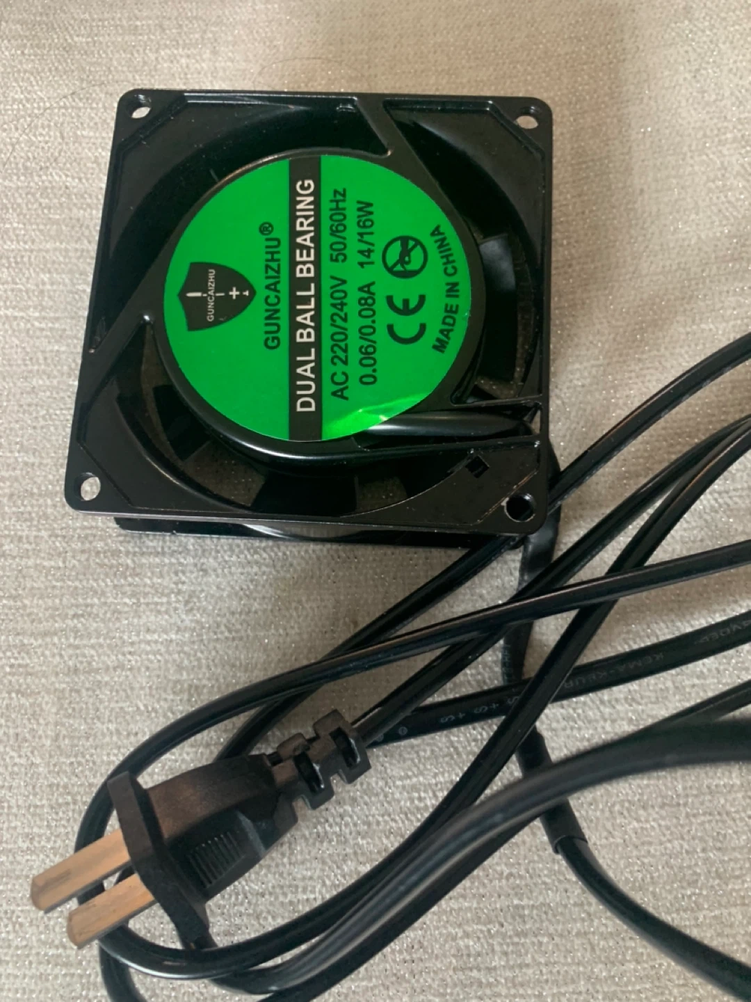 GUNCAIZHU dual ball bearing fan. AC 220-240V, 50/60Hz, 0.06/0.08A, 14/16W. Dimensions are 80mm x 80mm x 25mm. Includes power cord.