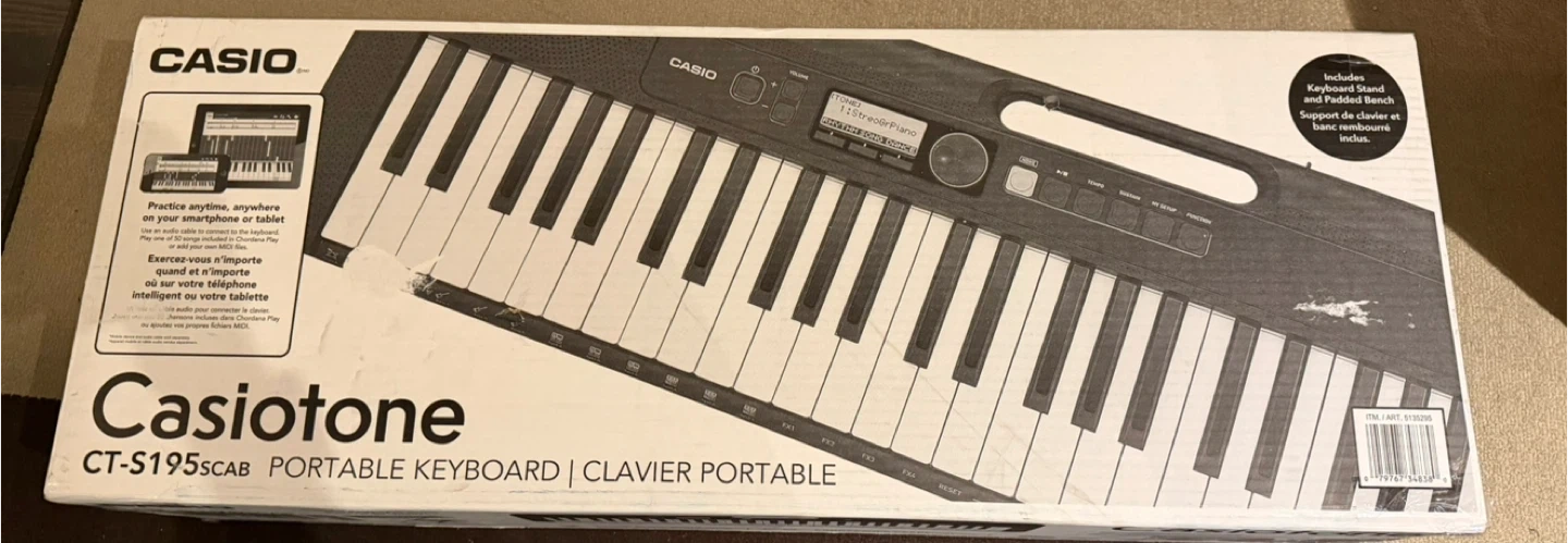 This Casio CT-S195 Casiotone portable keyboard comes with a keyboard stand and padded bench. It offers 400 tones and 77 rhythms.