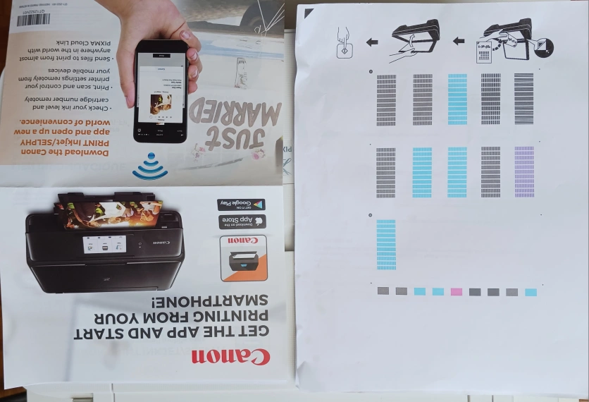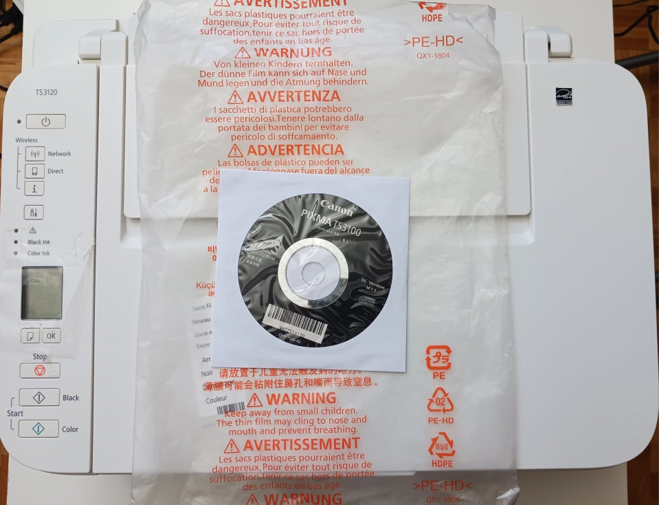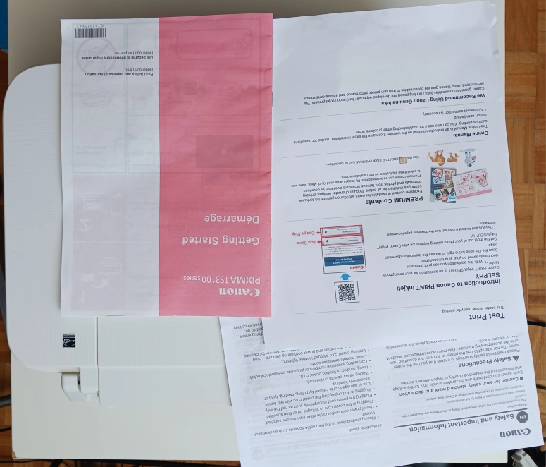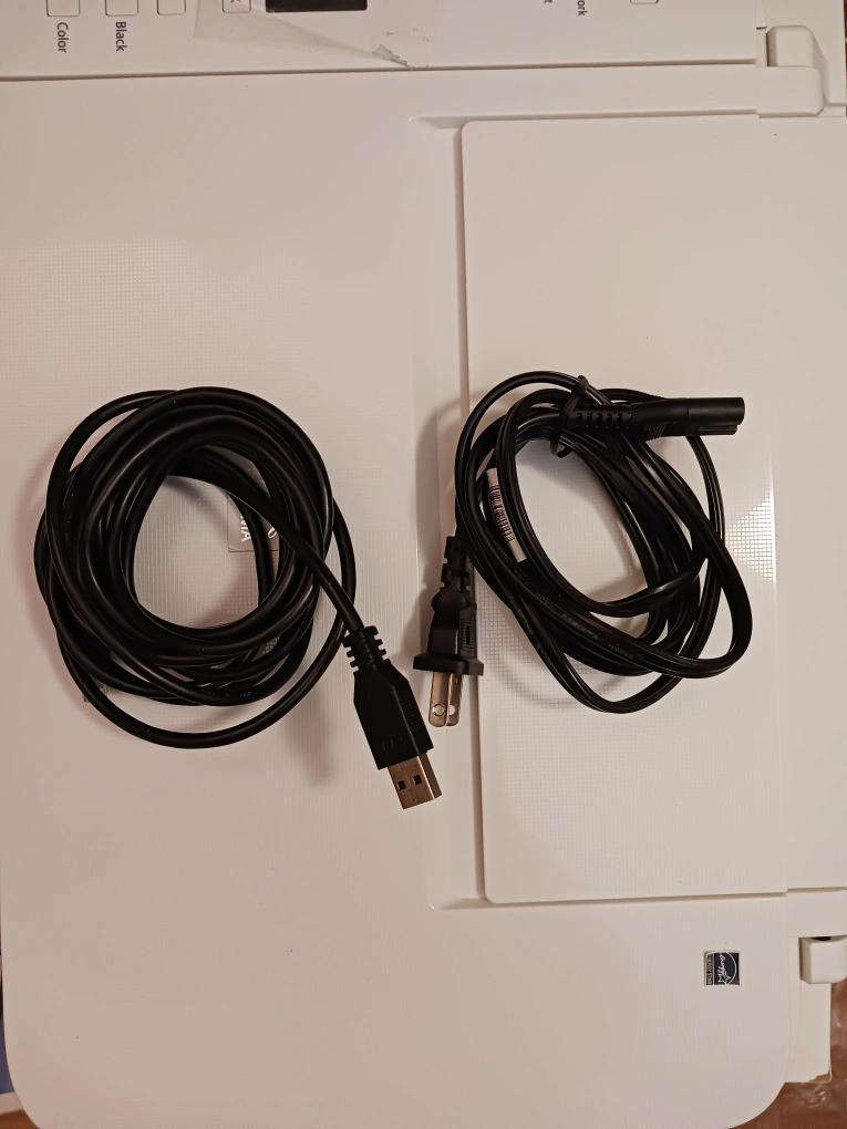 Compact wireless printer. Includes setup instructions. Scans and copies. Great for home use. Easy to use. No ink included