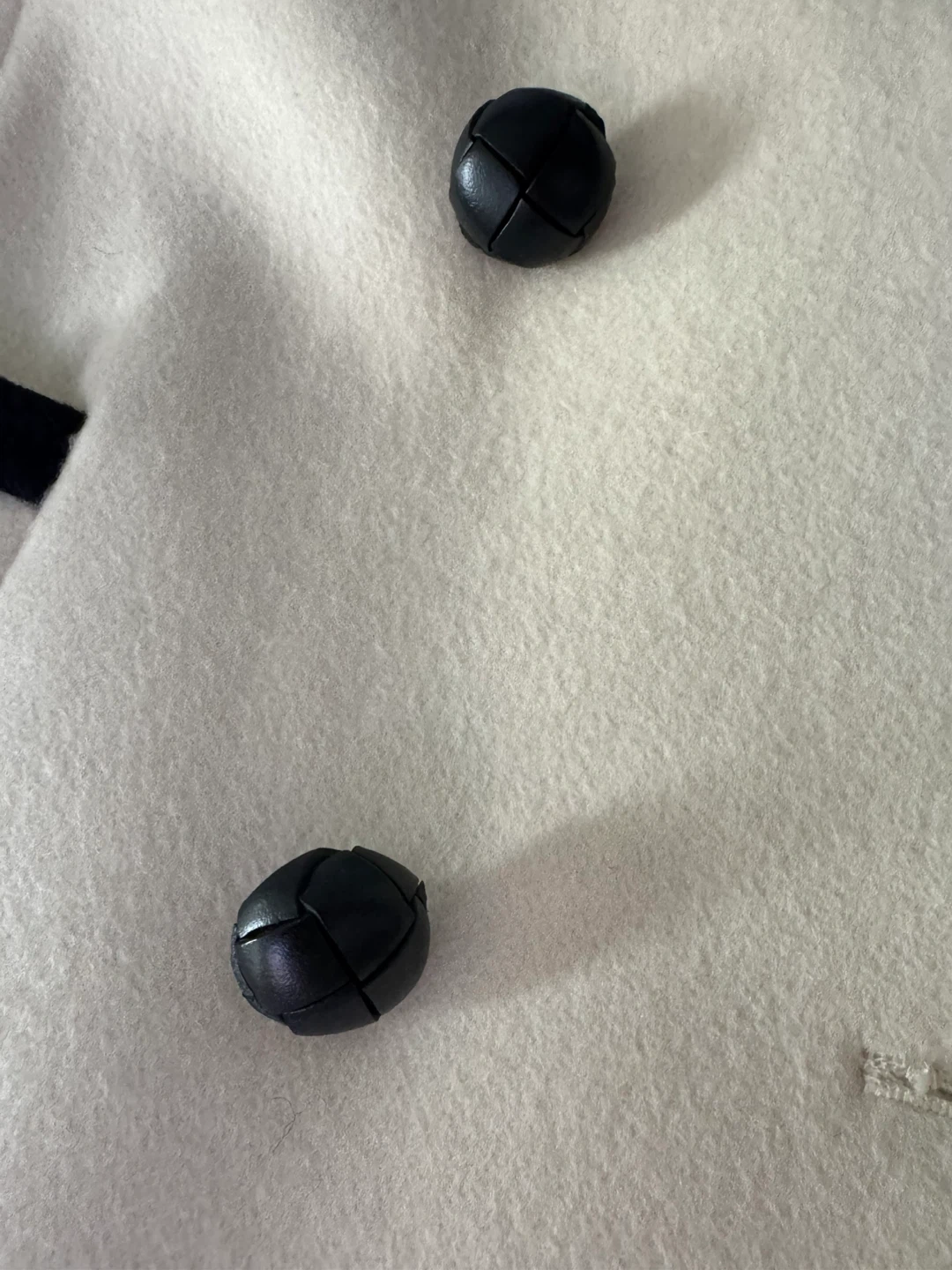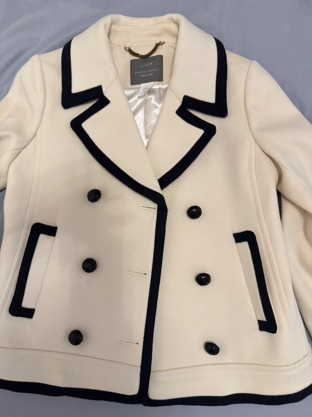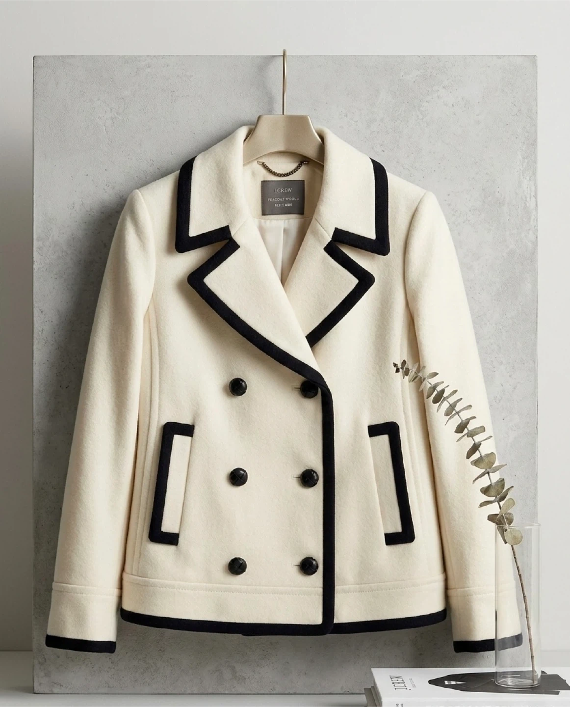 • Design: Classic cream/off-white wool blend featuring elegant black contrast piping and stylish leather-wrapped buttons.