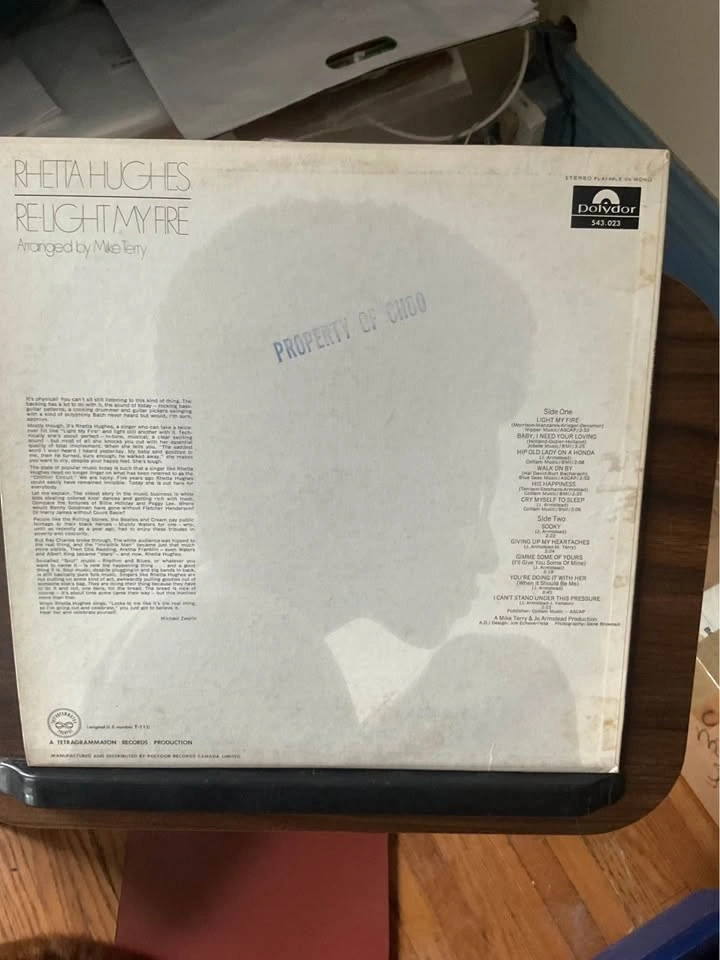 Rhetta Hughes was an American soul singer who released her debut album, "Re-Light My Fire," in 1969 on the Tetragrammaton label. The album featured a blend of soul, funk, and R&B, showcasing her powerful vocals. Original pressings are relatively rare and sought after by collectors. "Re-Light My Fire" is noted for its unique cover art. The album has gained a cult following among soul and funk enthusiasts. Property of CHOO RADIO. Cover a bit worn but graphic is good.