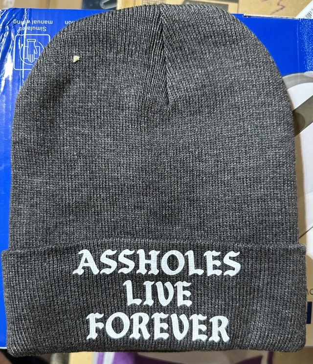 Add a touch of irreverent style to your wardrobe with this ALF - Assholes Live Forever beanie! This brand new, unworn beanie features bold text and a comfortable fit, perfect for making a statement while keeping warm. Make a statement and get ready for its first adventure. I've priced it competitively. Life's too short to be boring – grab this beanie and let your personality shine! Asking $10. Smoke-free home. Check out my other ads. Pick up in Hespeler, Cambridge.