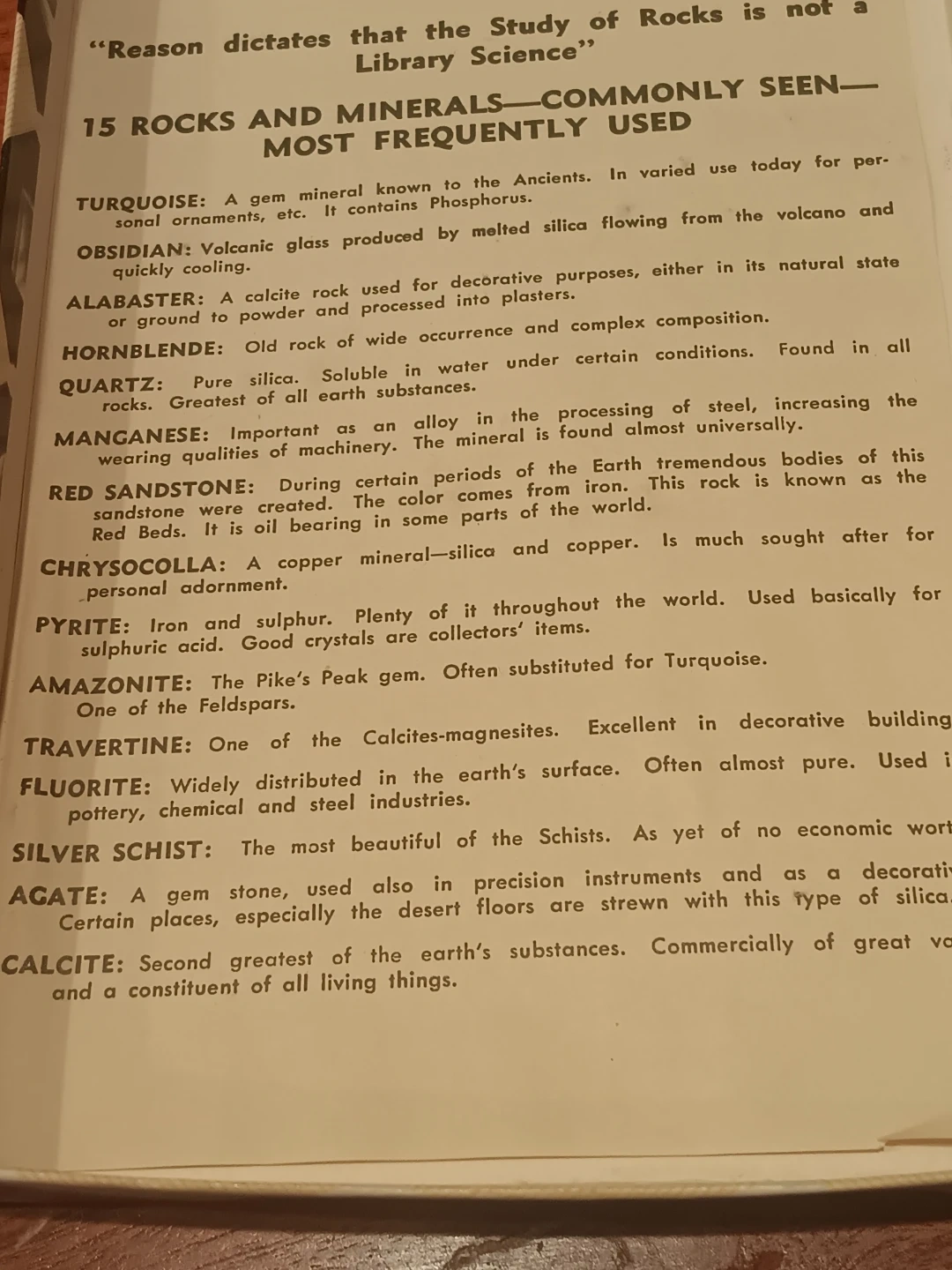 This vintage kit displays 15 common rocks and minerals with labels. Includes specimens like Turquoise, Obsidian, Alabaster, Quartz, and Calcite. Perfect for educational purposes or a unique display!