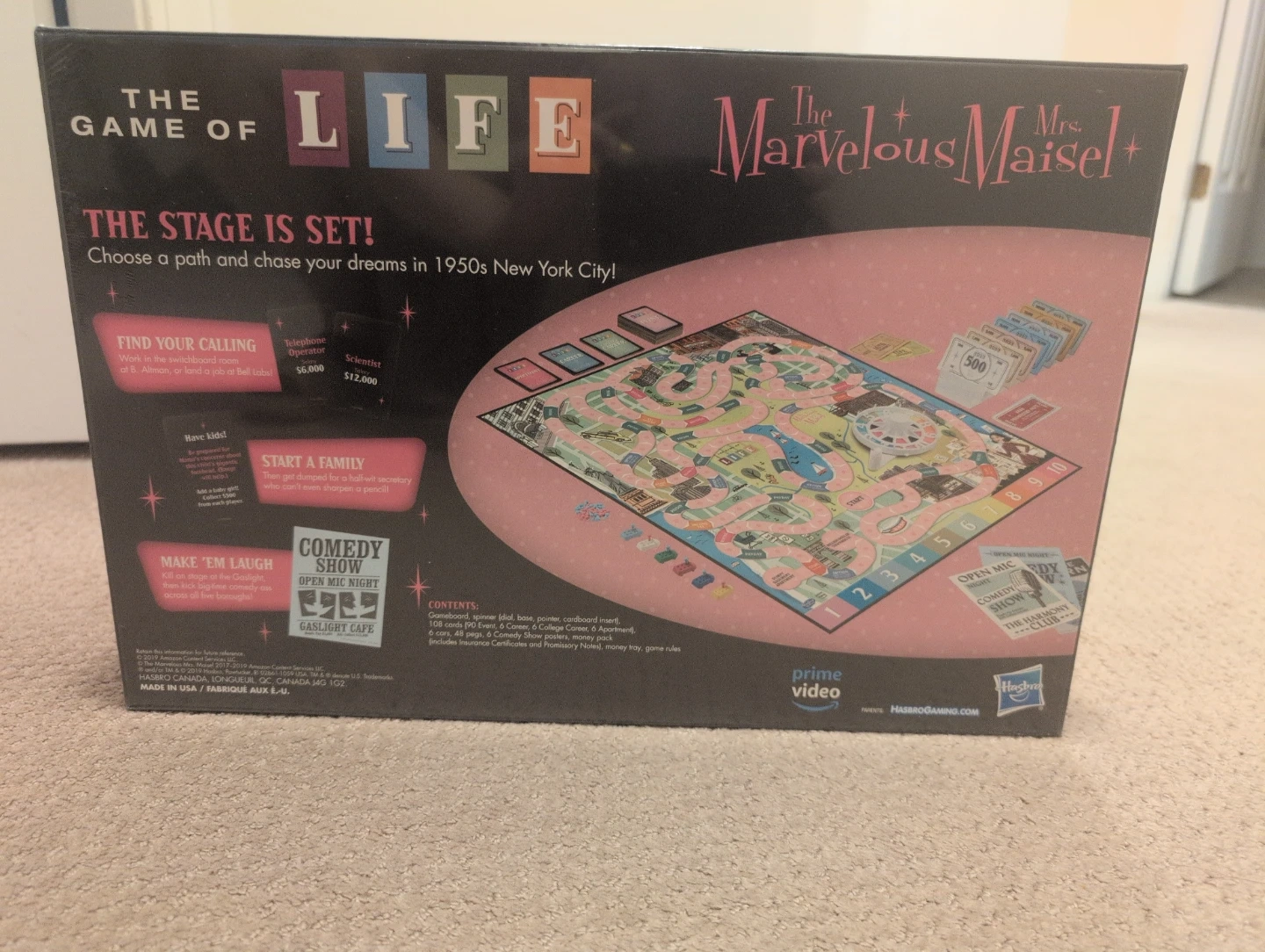 This is The Game of Life: The Marvelous Mrs. Maisel Edition board game. It's set in 1950s New York City and features a unique storyline. The game includes a game board, spinner, cars, pegs, money, and cards. Ages 14+.
