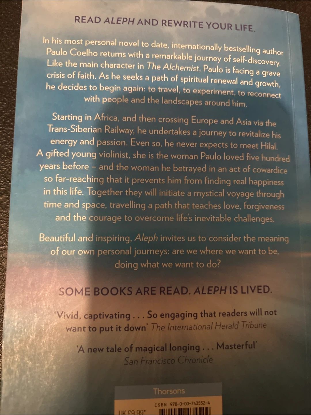This is Paulo Coelho's "Aleph," an international bestseller about a spiritual journey of renewal and growth. It follows the main character as he confronts a crisis and embarks on a transformative adventure. The book explores themes of love, forgiveness, and overcoming life's challenges.