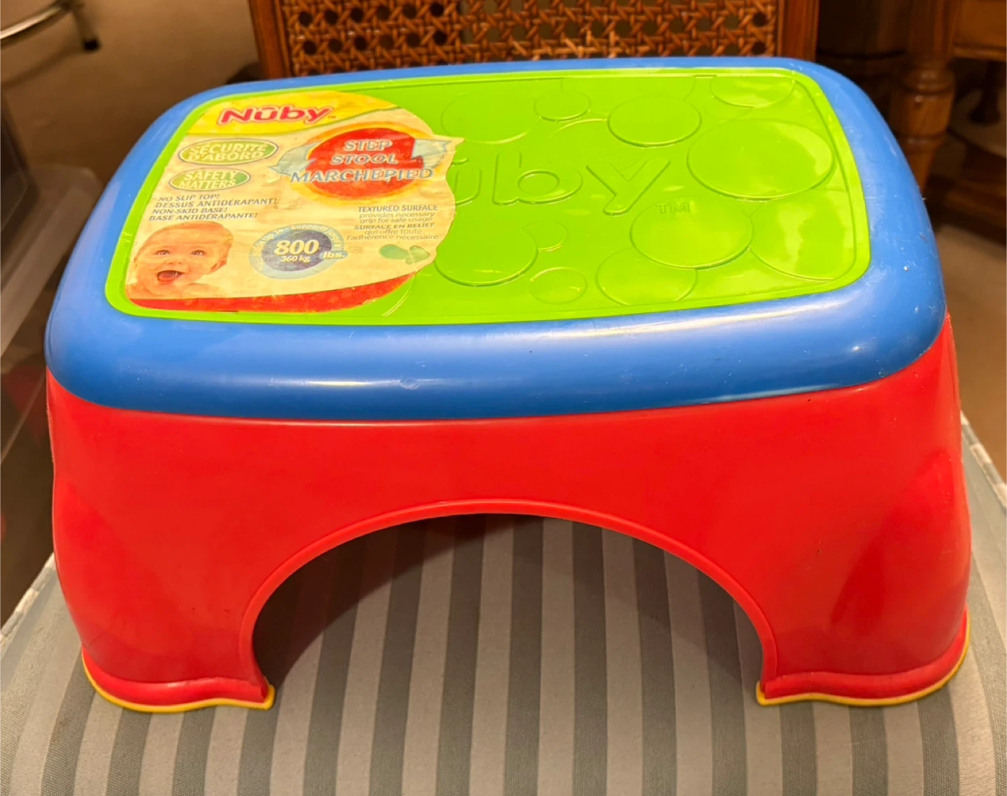 I'm selling a Nuby step stool, perfect for helping your little one reach new heights! It features a non-slip base for added safety and can support up to 800 lbs 😊
