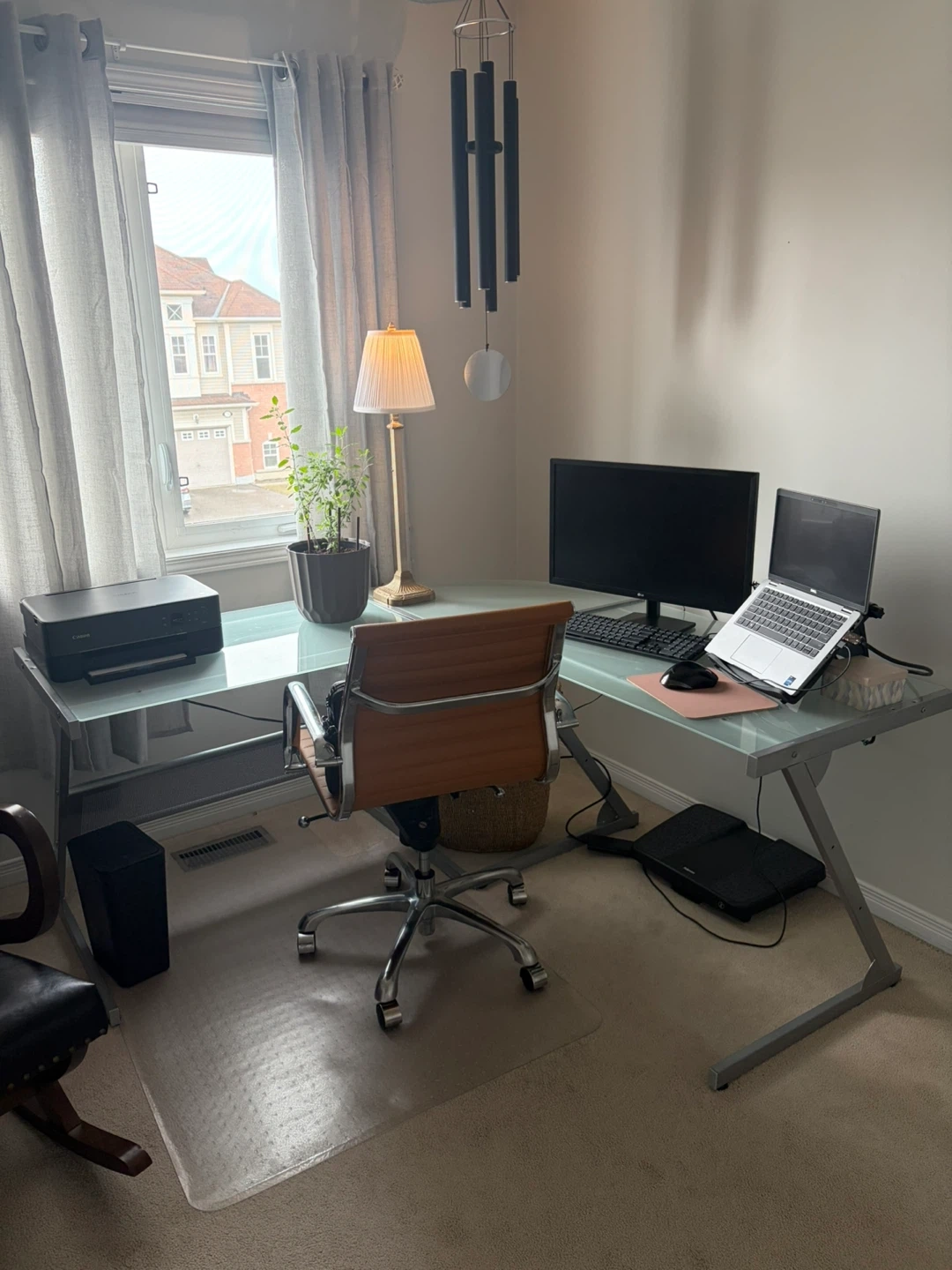 Spacious L-shaped desk with a modern glass top and silver metal frame. It offers ample workspace for computers and office supplies. The desk is designed to fit well in a home office setting.
