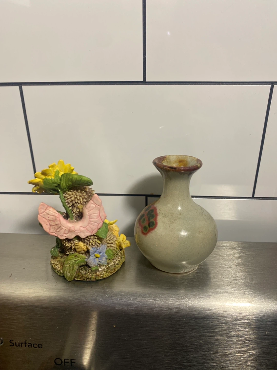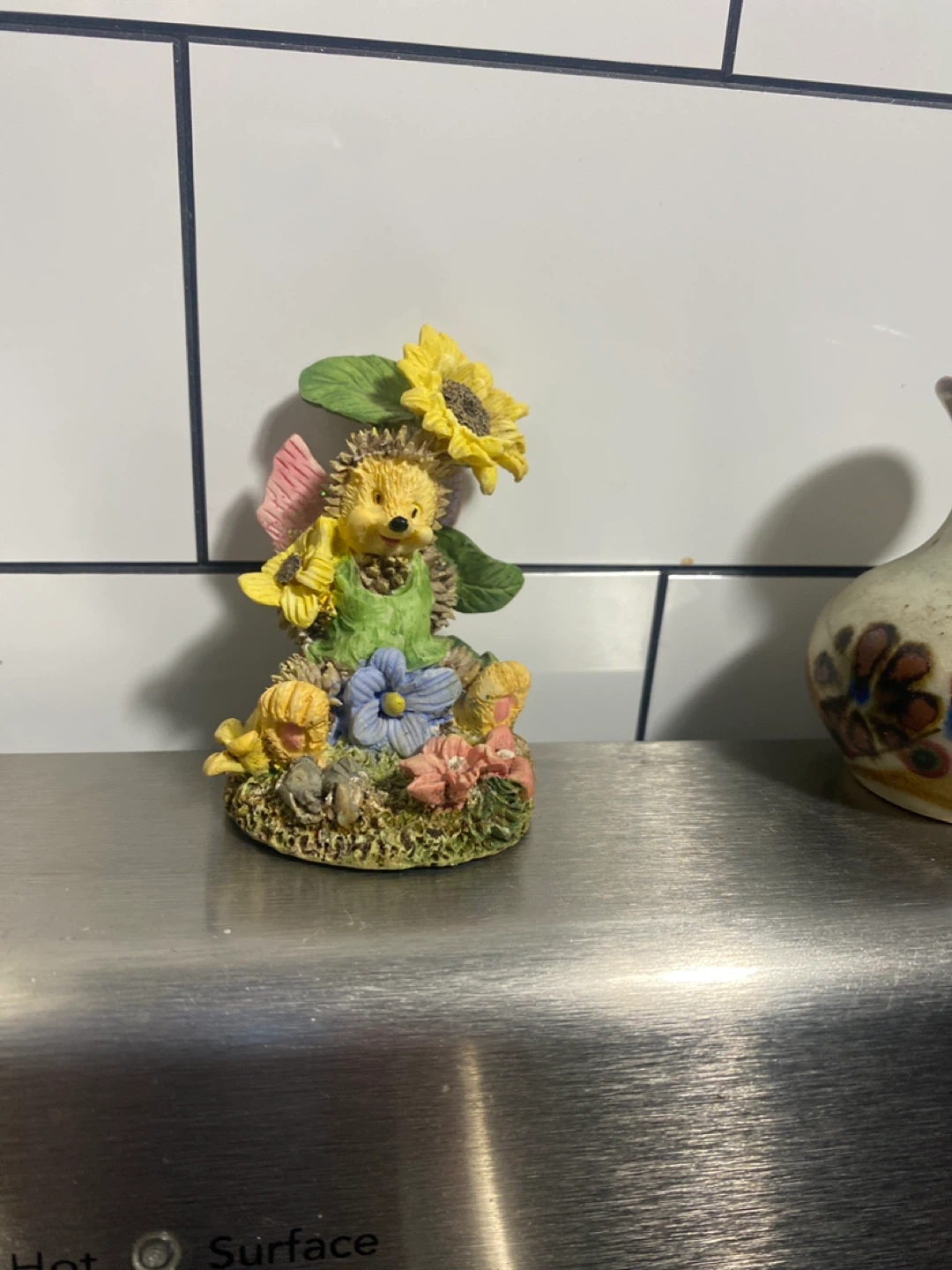 Selling a decorative vase and a cute hedgehog figurine. Both are in good condition and would look great on a shelf or desk! The vase has a unique floral pattern, and the hedgehog is surrounded by colourful flowers