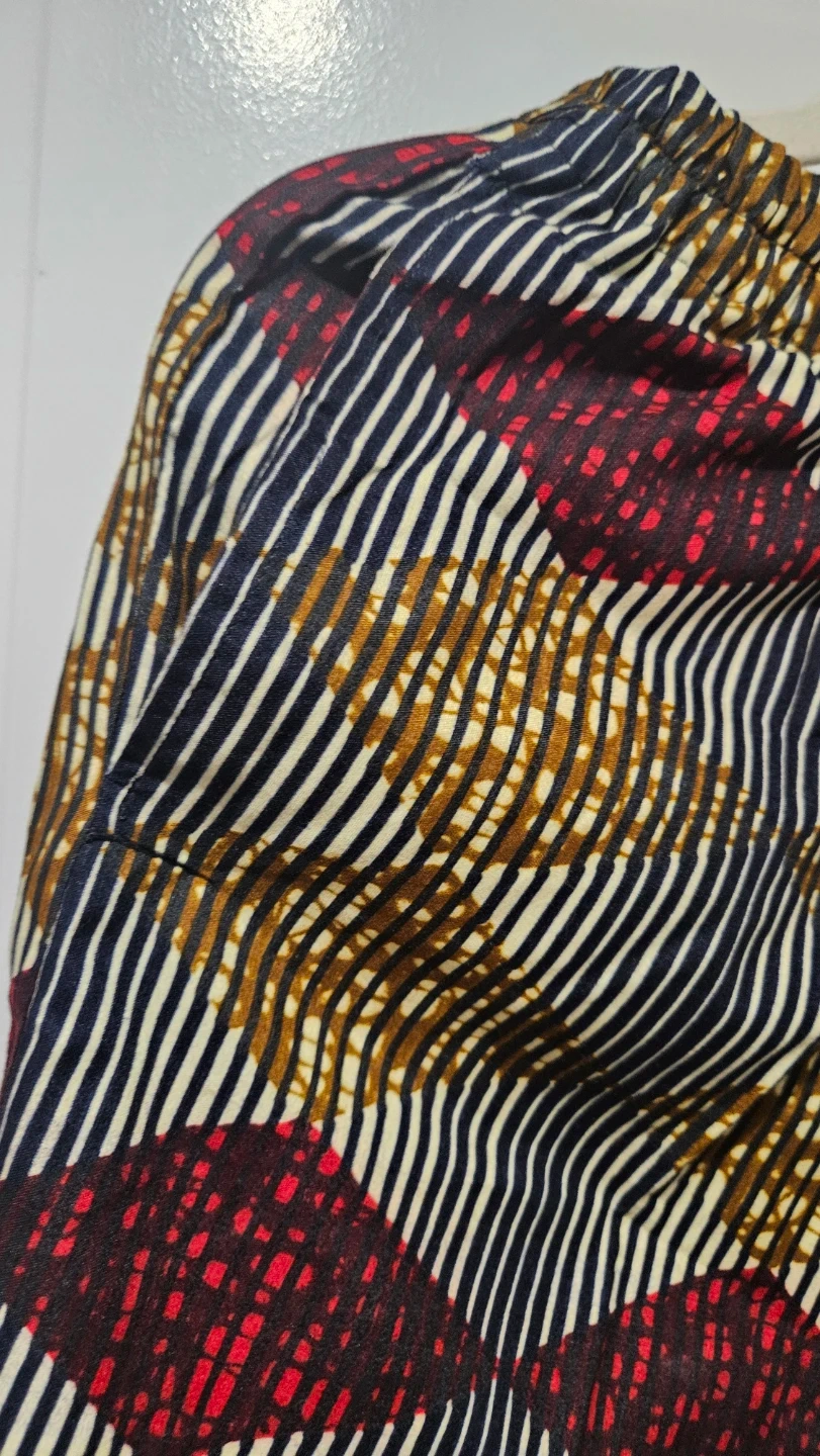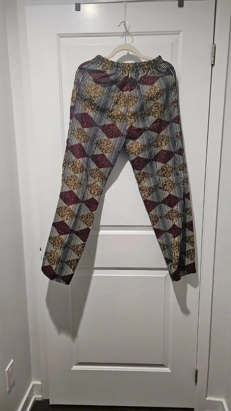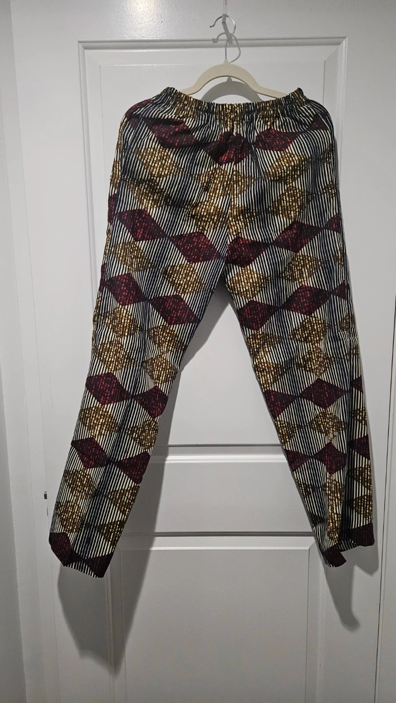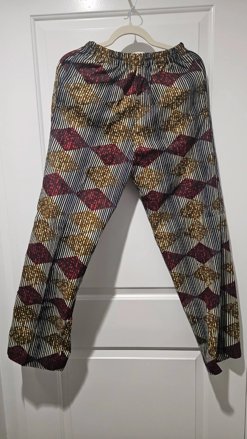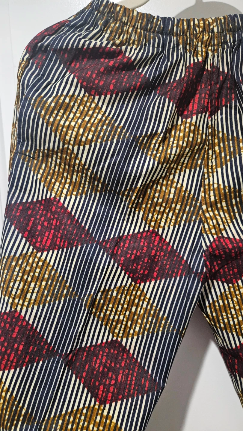 Stylish pants feature a bold, colourful pattern with dark blue, red, and gold accents. They have an elastic waistband for a comfortable fit. Made from a lightweight fabric. Can buy with or without the matching button down shirt for an extra $5. See shirt listing in my full listings.