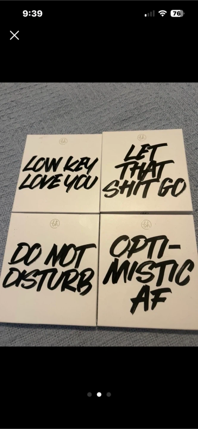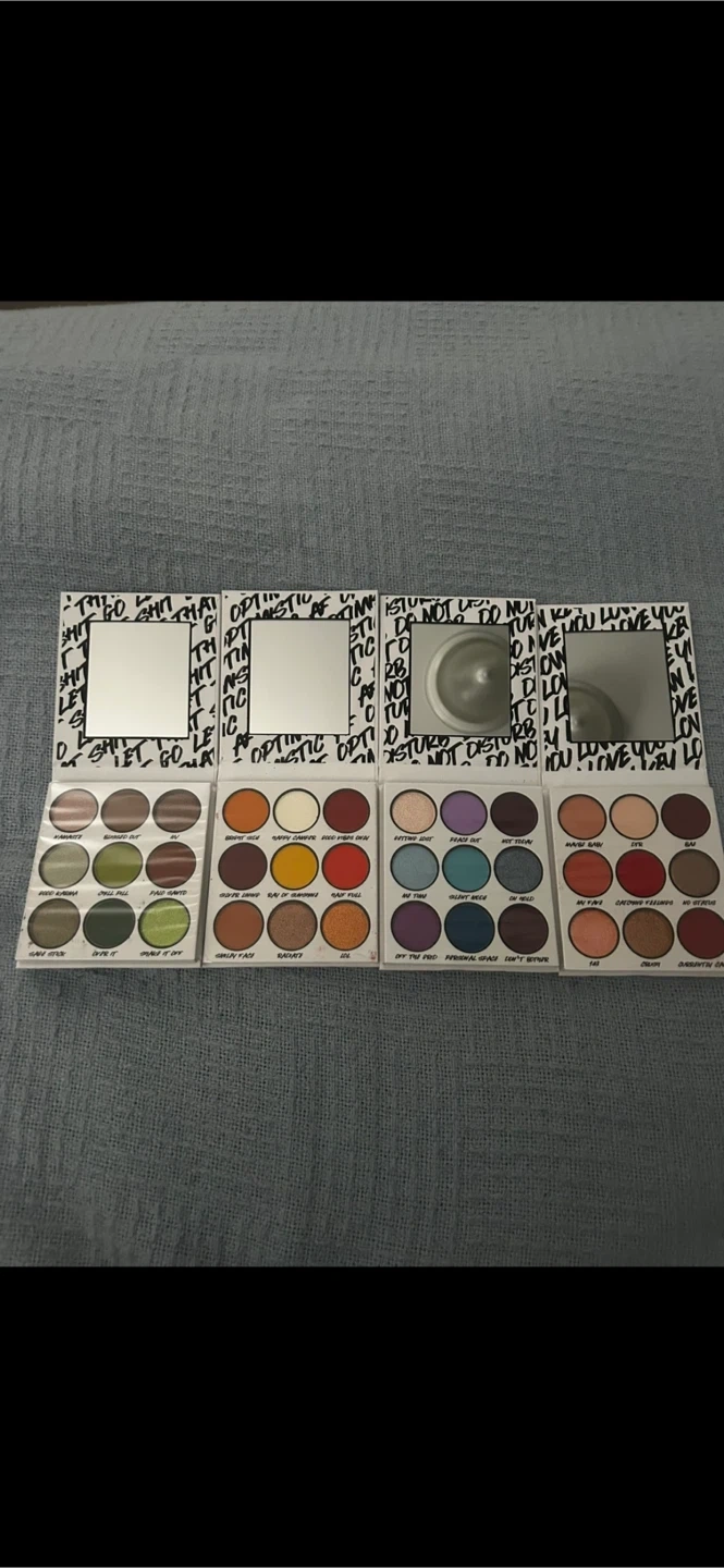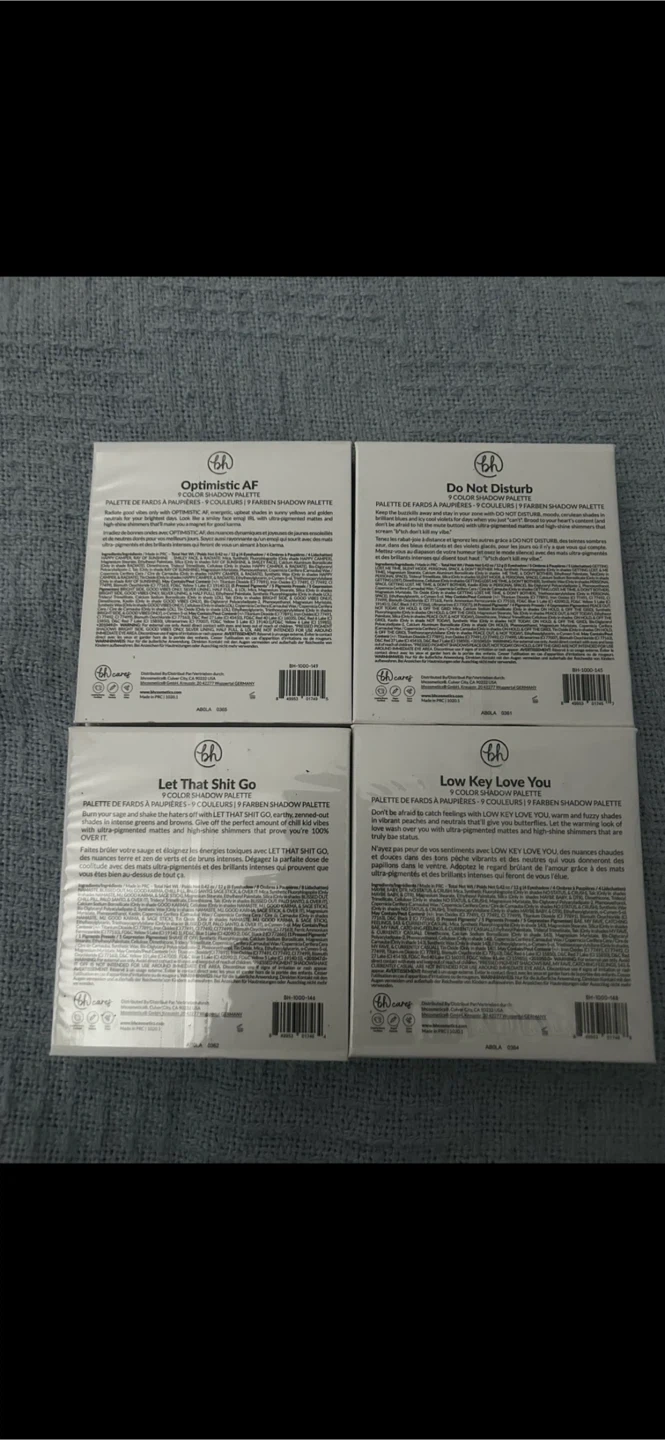 Brand new BH Cosmetics eyeshadow palette collection. Includes 'Optimistic AF', 'Do Not Disturb', 'Let That Sh*t Go', and 'Low Key Love You' palettes. Each palette features 9 shades with a mix of mattes and shimmers.