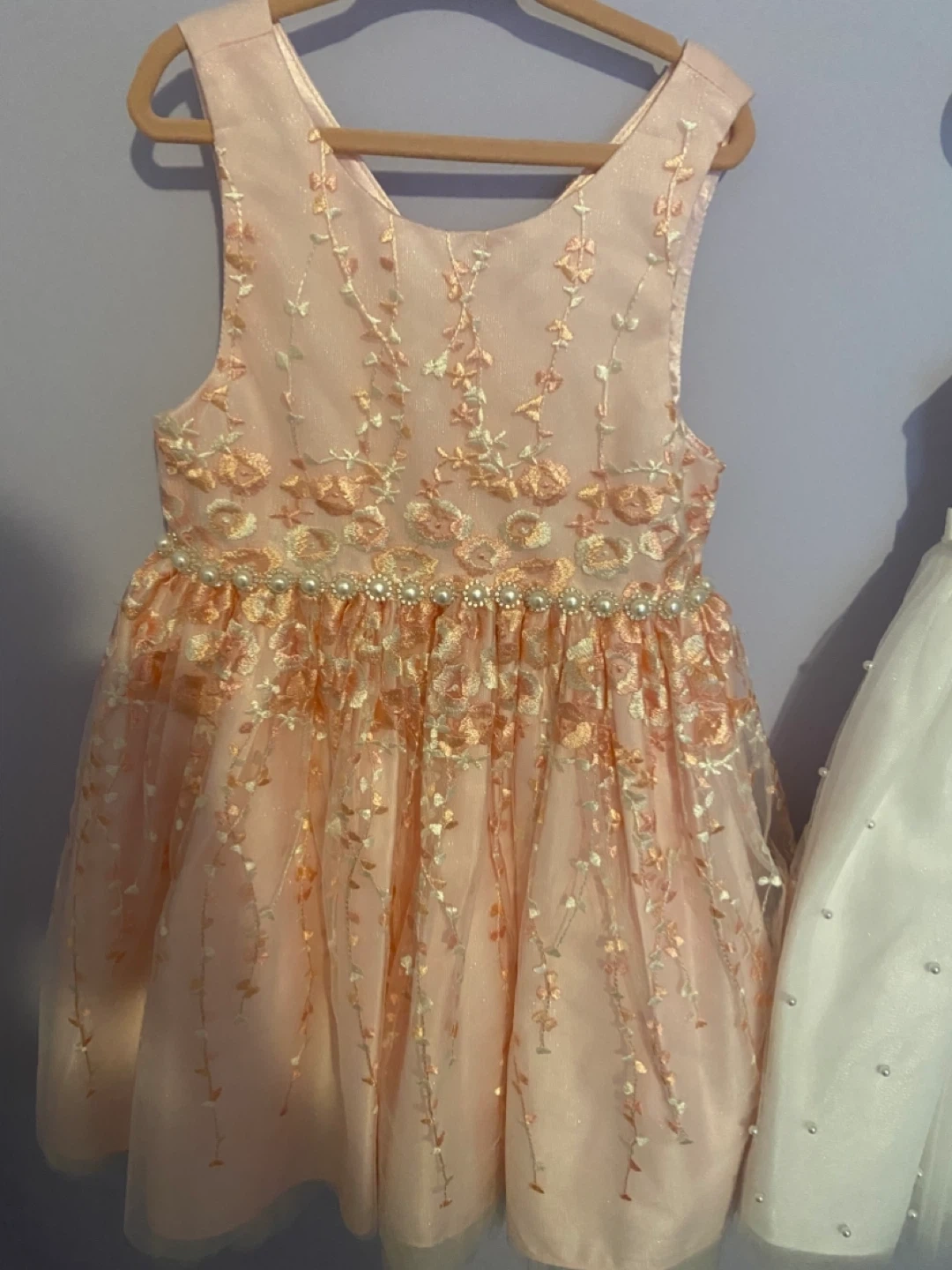 This lovely pink and white party dress features delicate embroidery and pearl accents along the waistband. It has a sleeveless design with a tulle overlay, perfect for special occasions. The dress is made from lightweight, shimmering fabric.