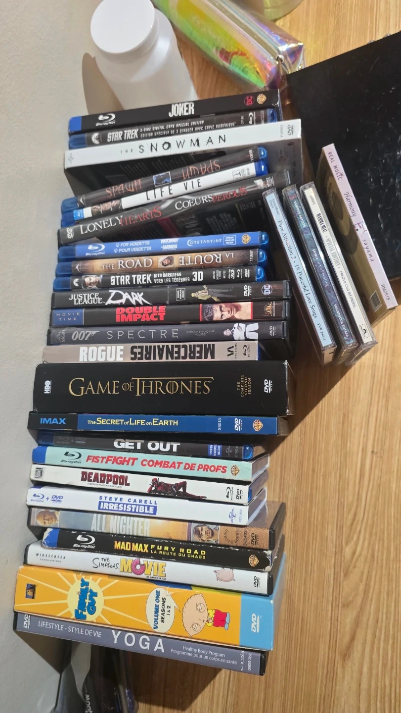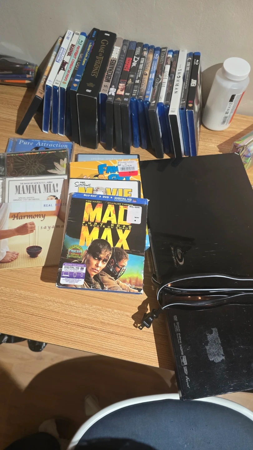 Blu Ray CD player. A collection of assorted movies and music on Blu-ray, DVD, and CD formats. Includes titles like Star Trek, The Snowman, Mad Max: Fury Road, and various other popular movies and albums.