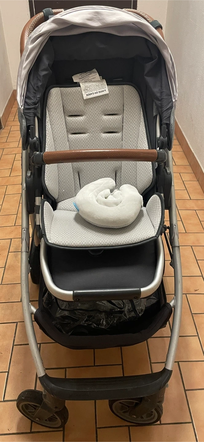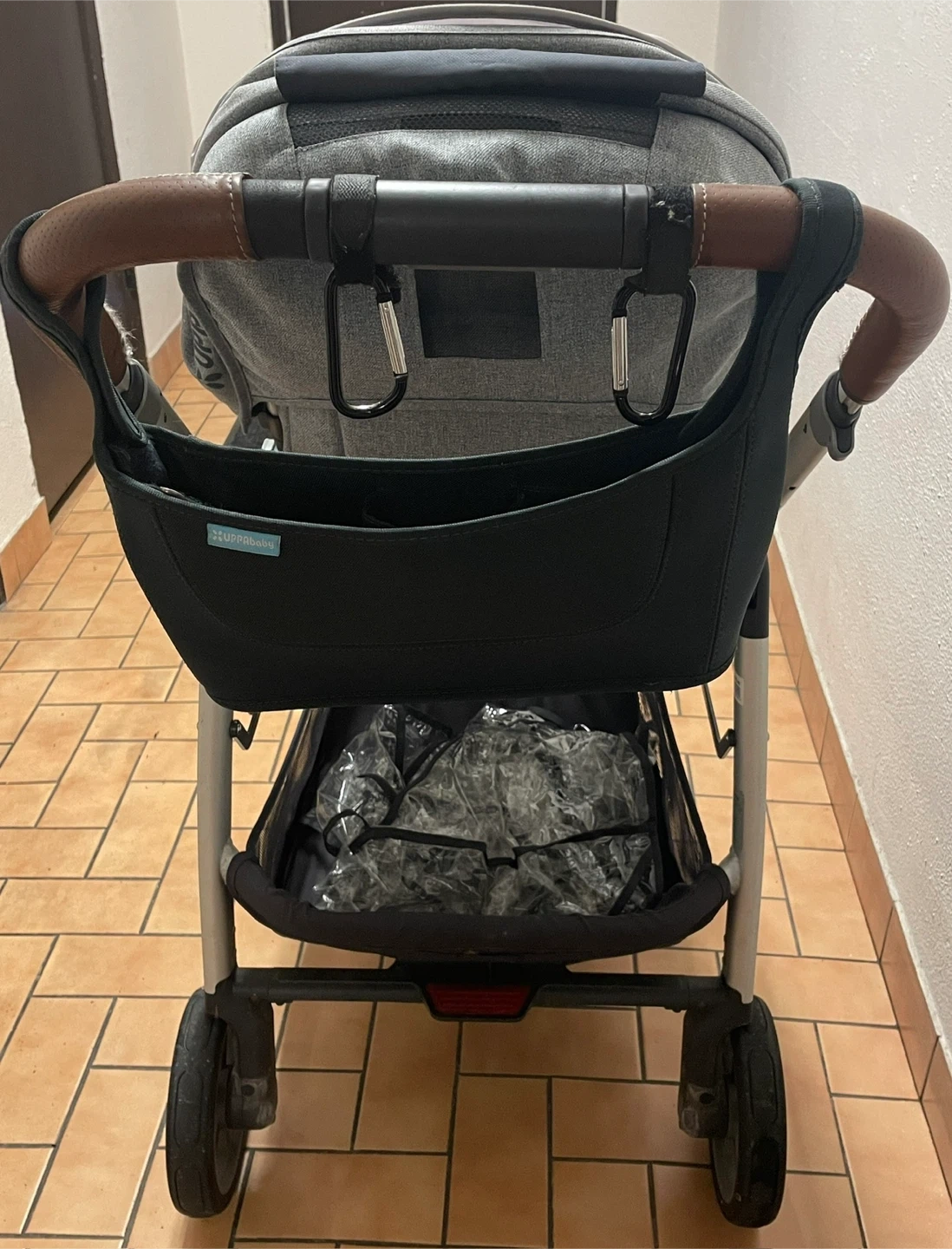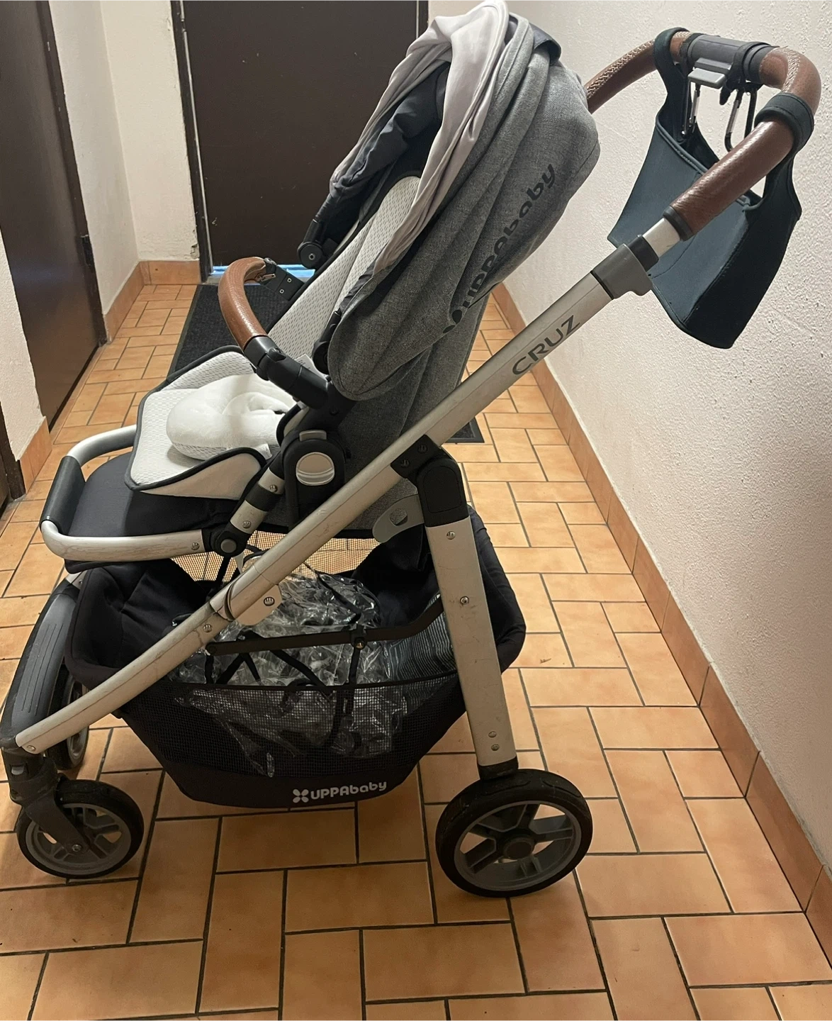 UPPAbaby Cruz stroller in a grey marl fabric with leatherette handle details. It includes a large storage basket underneath and a parent organizer bag. This stroller is suitable for daily use and easy to manoeuvre. Includes a raincover.