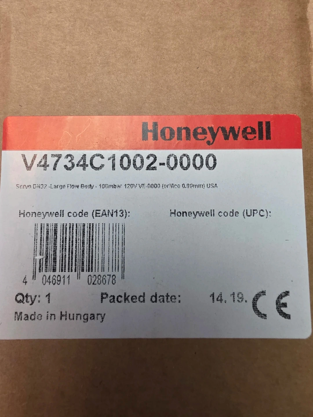 Honeywell Servo Regulated Gas Valve, model V4734C1002-0000. Type 1 1/4" (DN32) large flow body. Operates on 120 Vac. Packed on 14.19.