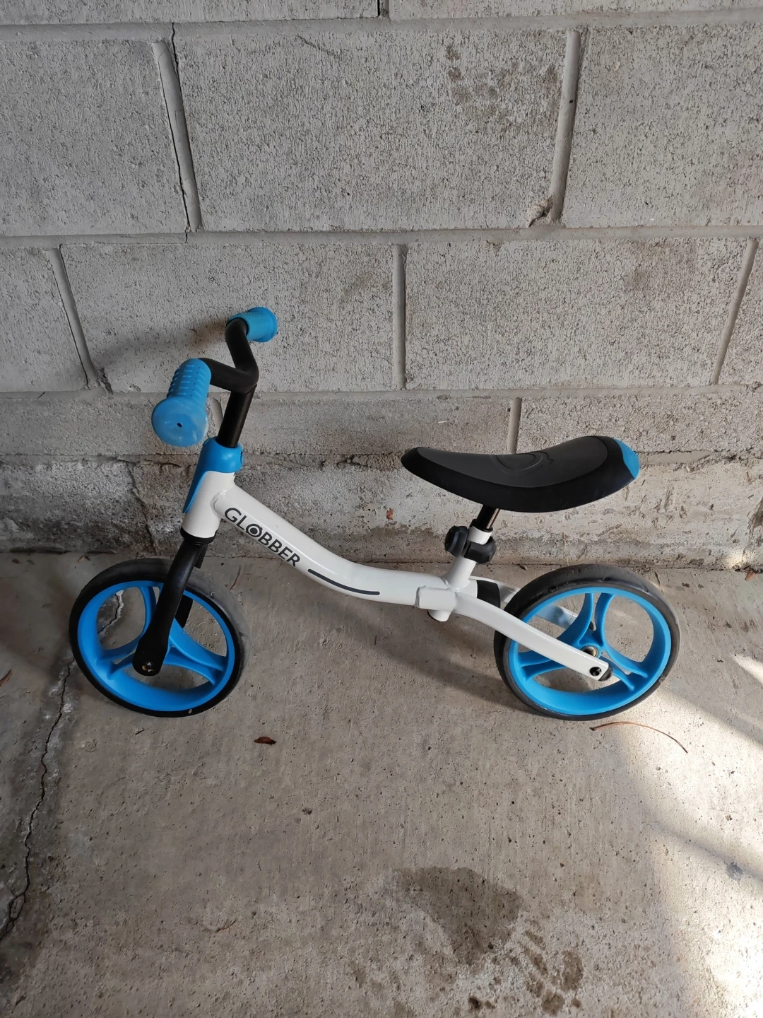 This is a white and blue Globber balance bike. It has a metal frame and blue grips and wheels. This balance bike is great for toddlers learning to balance before transitioning to a pedal bike.