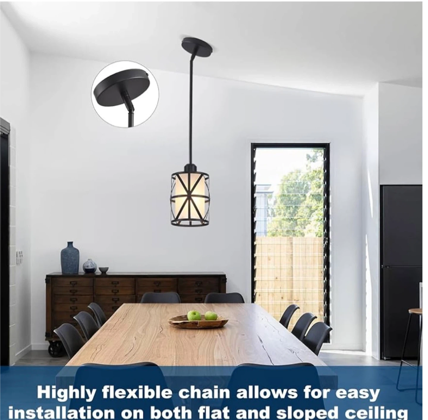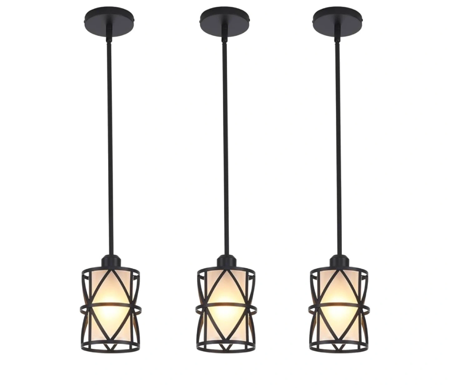 This is a set of three industrial-style pendant lights. They feature a black metal cage design surrounding a frosted glass cylinder. These lights are suitable for installation on both flat and sloped ceilings, making them versatile for various kitchen or dining spaces. They'd be great for adding a modern farmhouse or rustic touch to your home!