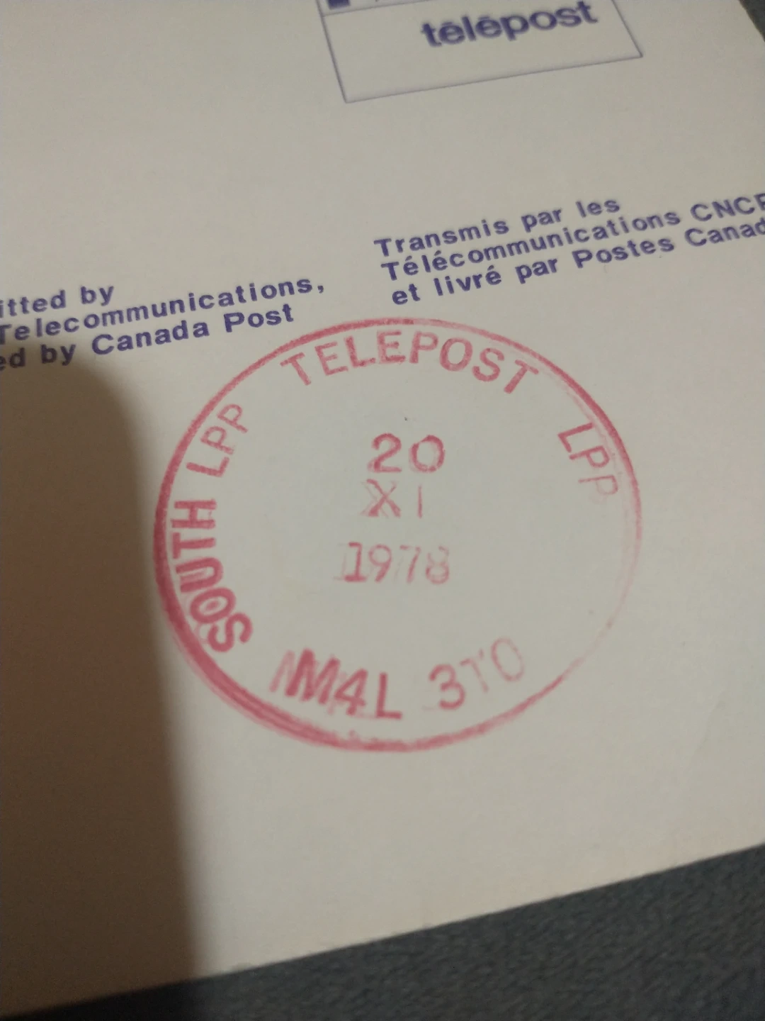 This is a Telepost envelope from 1978. It was transmitted by CNCP Telecommunications and delivered by Canada Post. The postmark indicates it was processed on November 20, 1978.