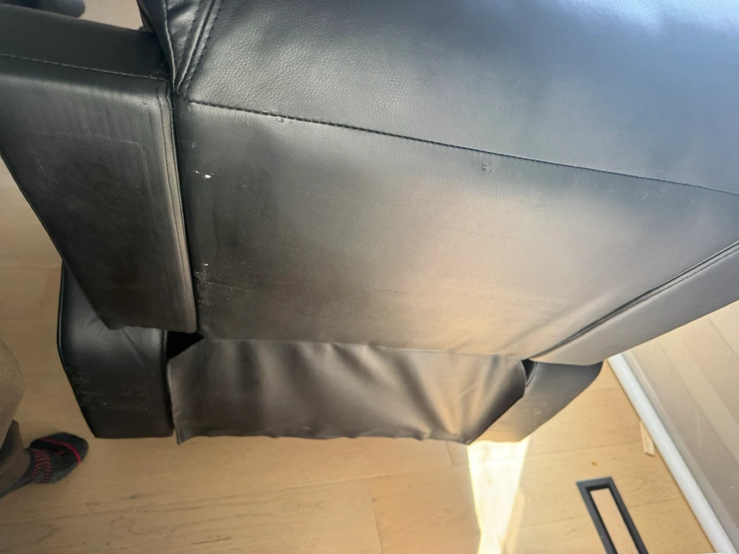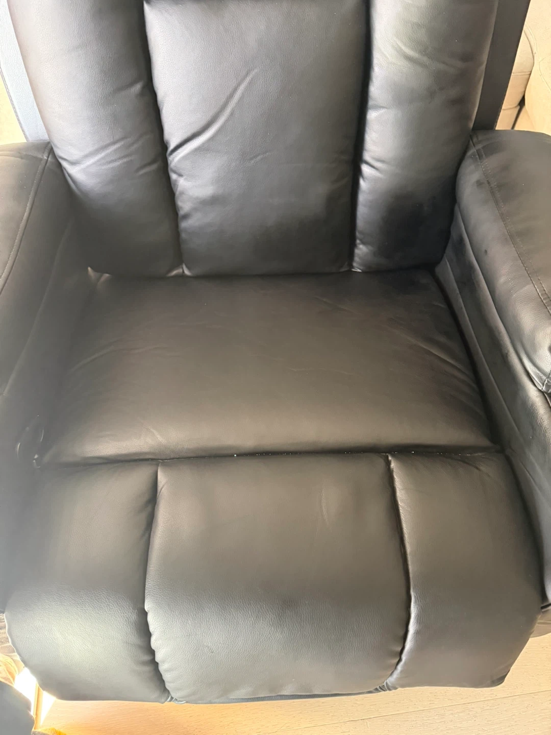 This black faux leather recliner chair offers comfort and convenience. It features two built-in cup holders on the armrests. The reclining mechanism works smoothly, making it great for relaxing.