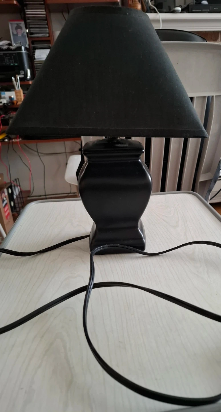 This is a black table lamp with a square shade. It's a nice accent piece for any room. The lamp has a classic design.