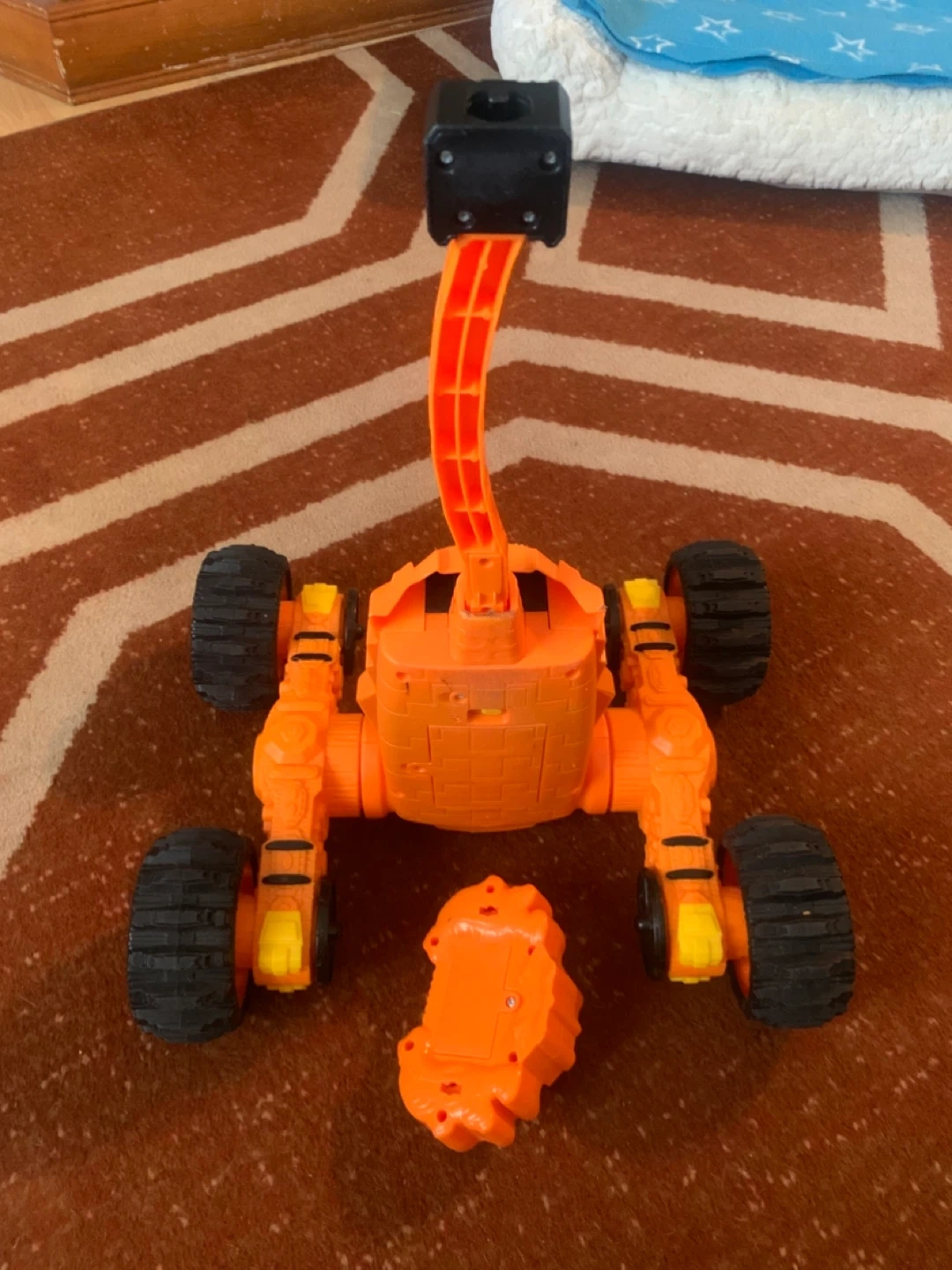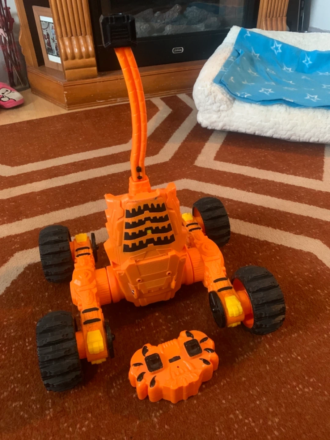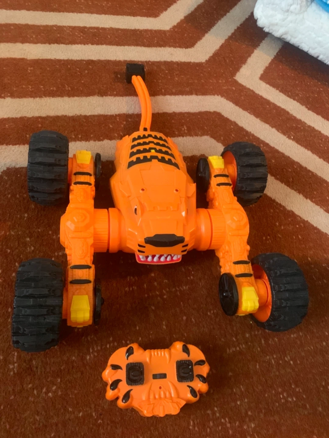 Fun remote-controlled stunt car shaped like a tiger. It's bright orange with big black wheels for off-road action. Comes with a cool tiger-themed remote control.