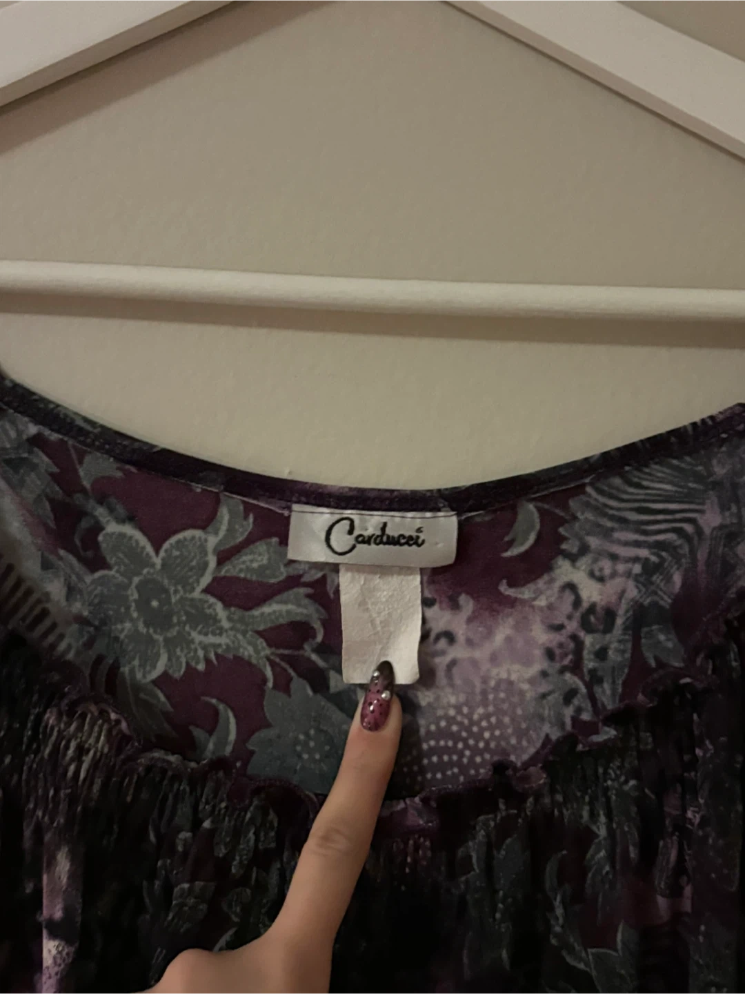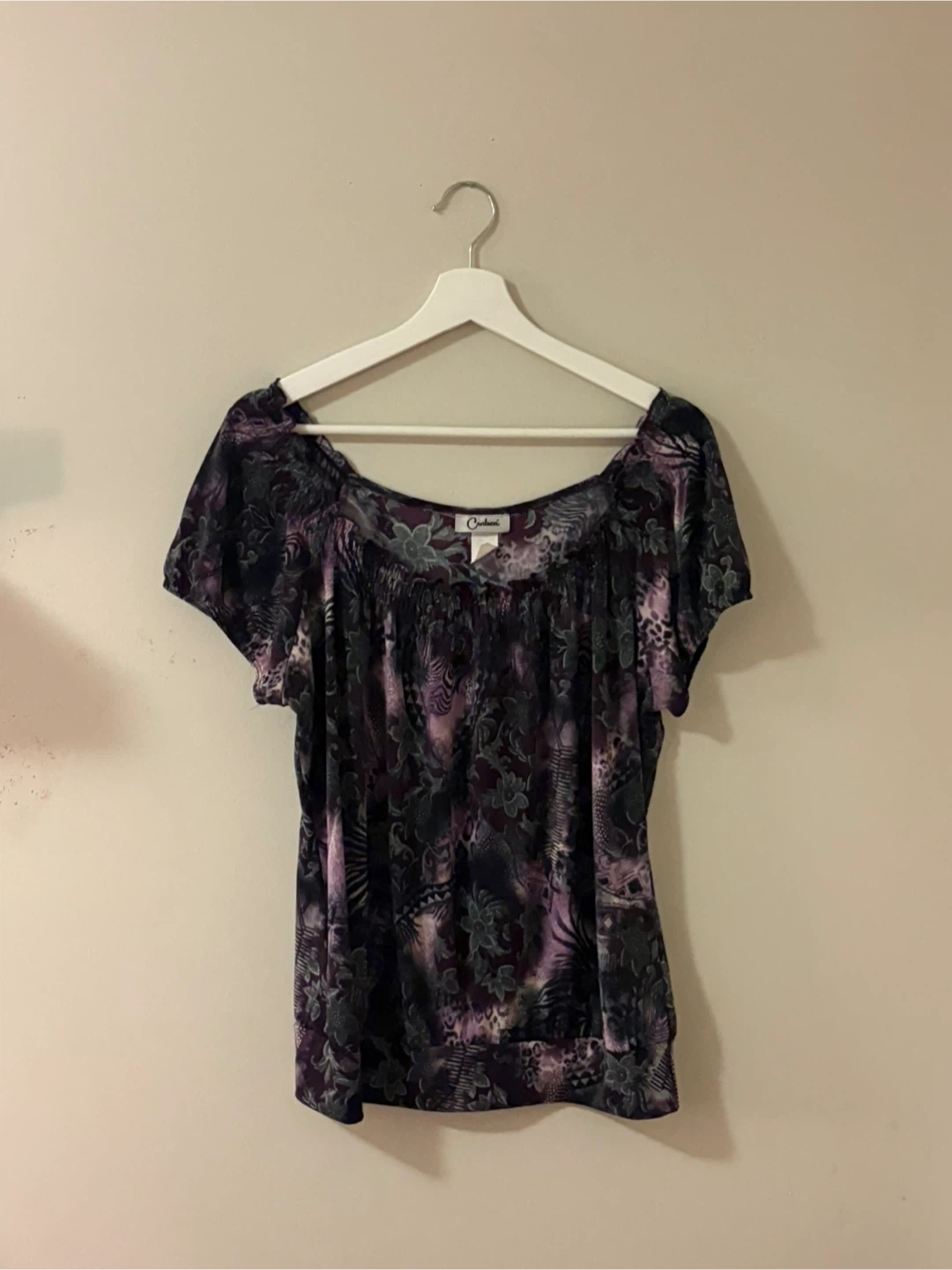 a super cute purple off the shoulder top that had a fluffy / elastic neckline (stretchy and comfy)!!