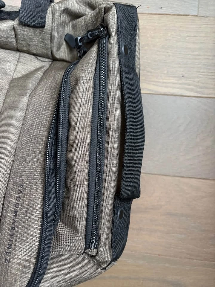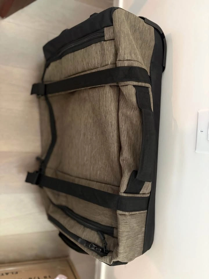 Black and khaki. Used once, like new. Sturdy construction with upper and side handles and belts for added protection. Features an inside pocket and a secret pocket on top. Aluminum frame, very light. Originally 49.99 euros.