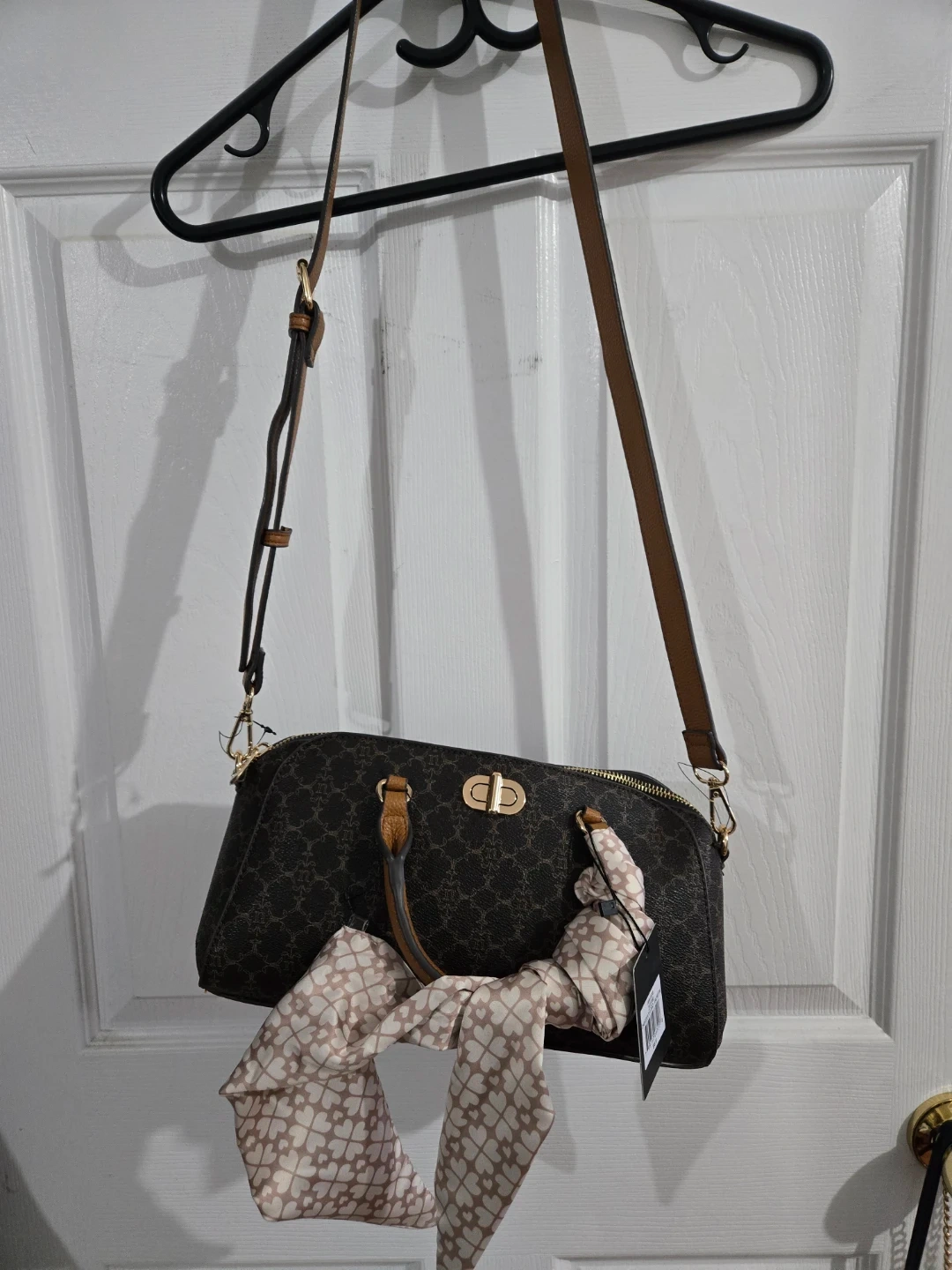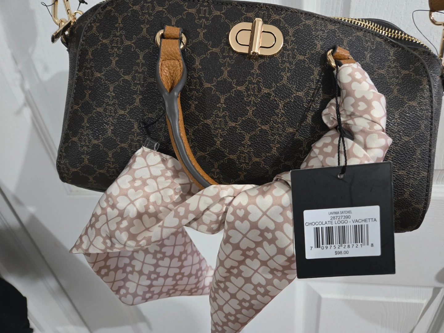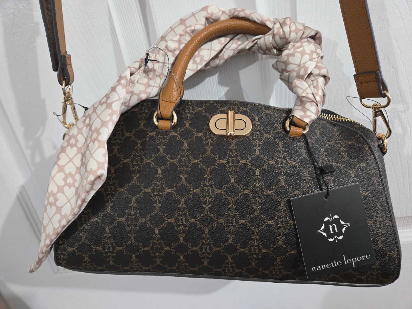 This Nanette Lepore satchel comes with a chic patterned scarf tied to the handle. It's a stylish accessory for any occasion. The bag is dark brown with a repeating logo pattern and tan accents.