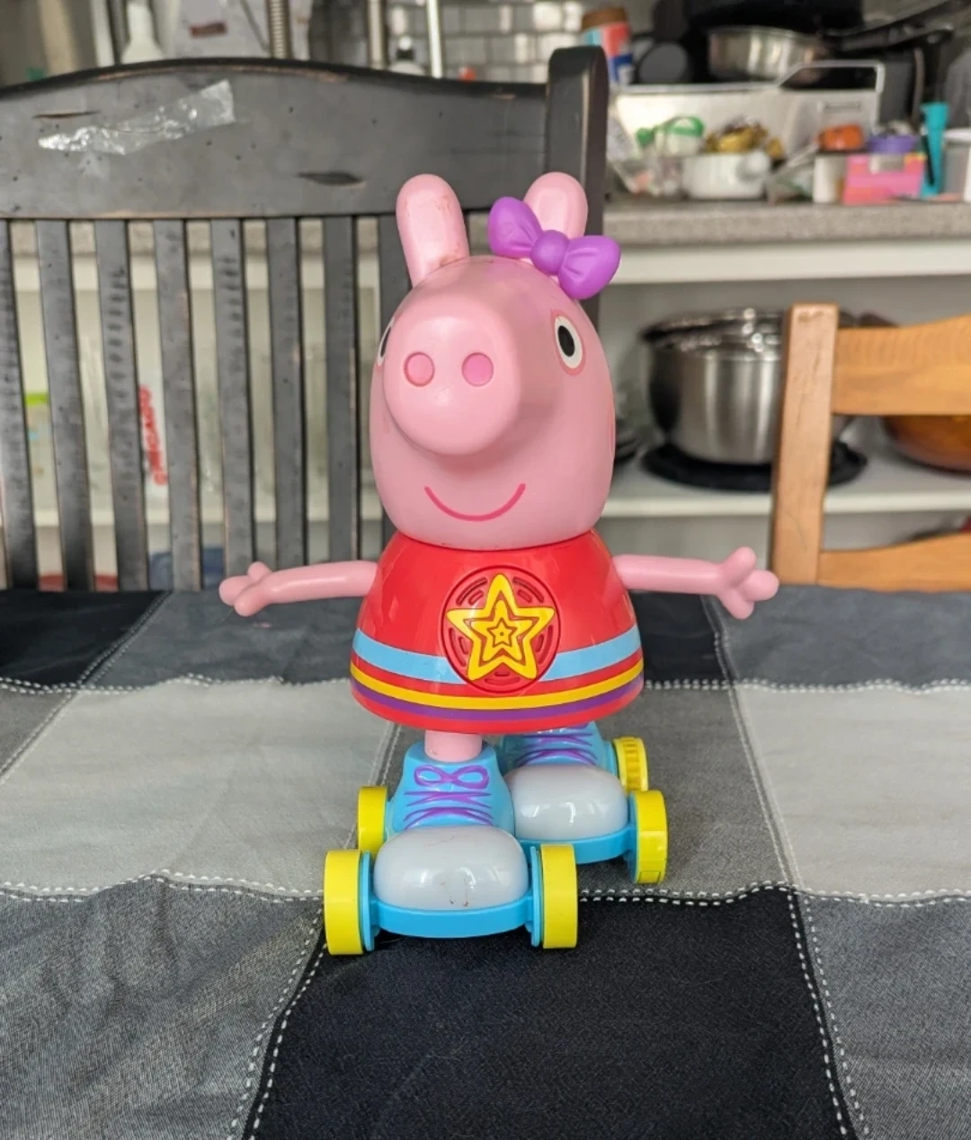 A Peppa Pig toy on roller skates. it moves and sings! It's pink and wears a red shirt with a star design and blue and yellow striped pants. This toy is great for little ones who enjoy imaginative play. It's made of plastic.