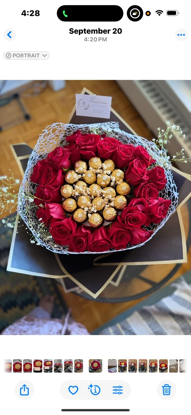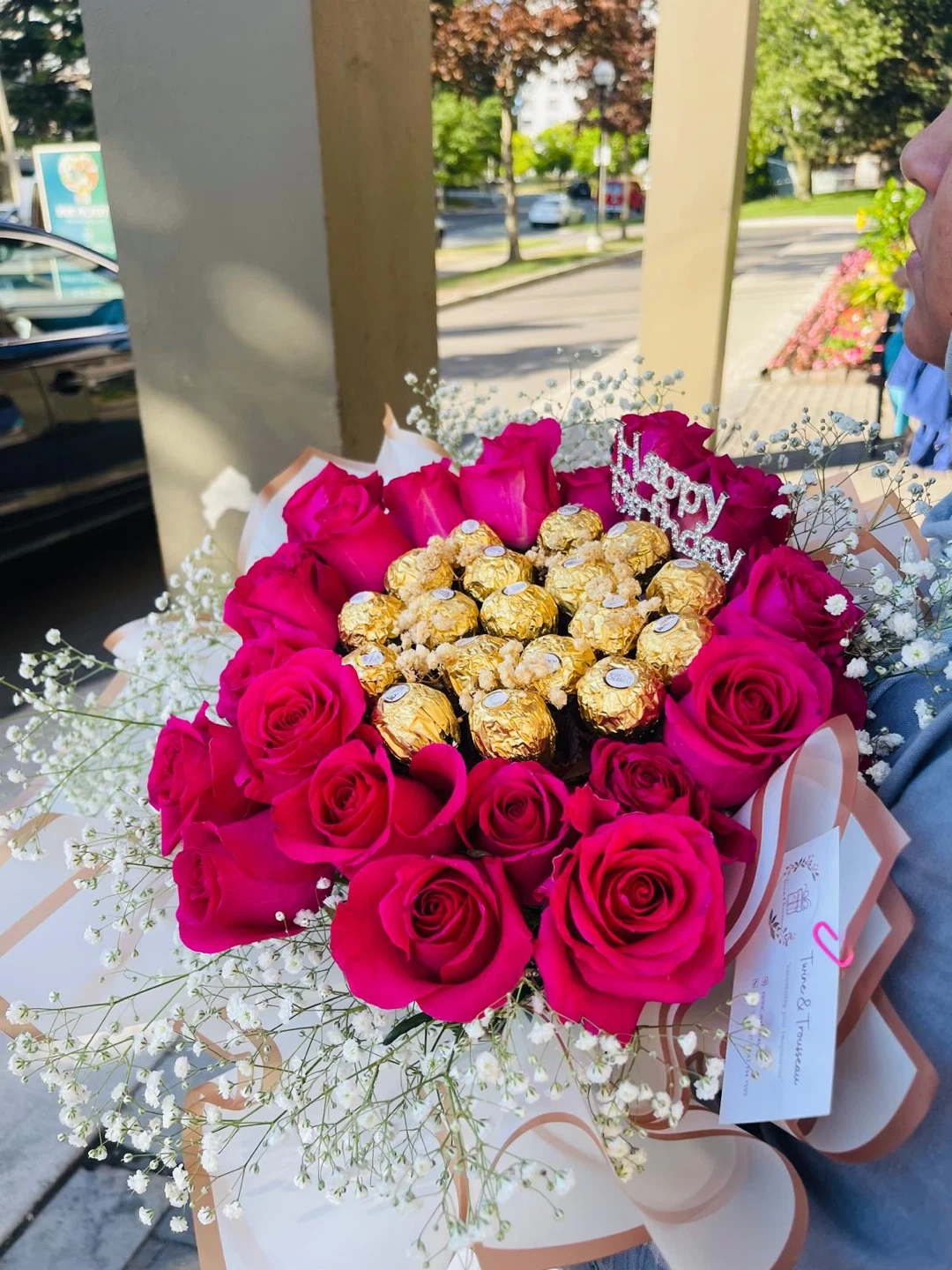 Beautiful bouquet featuring vibrant roses and Ferrero Rocher chocolates. It's perfect for any special occasion or as a sweet surprise! The arrangement includes decorative baby's breath and toppers and cards. Can be customized according to your taste.