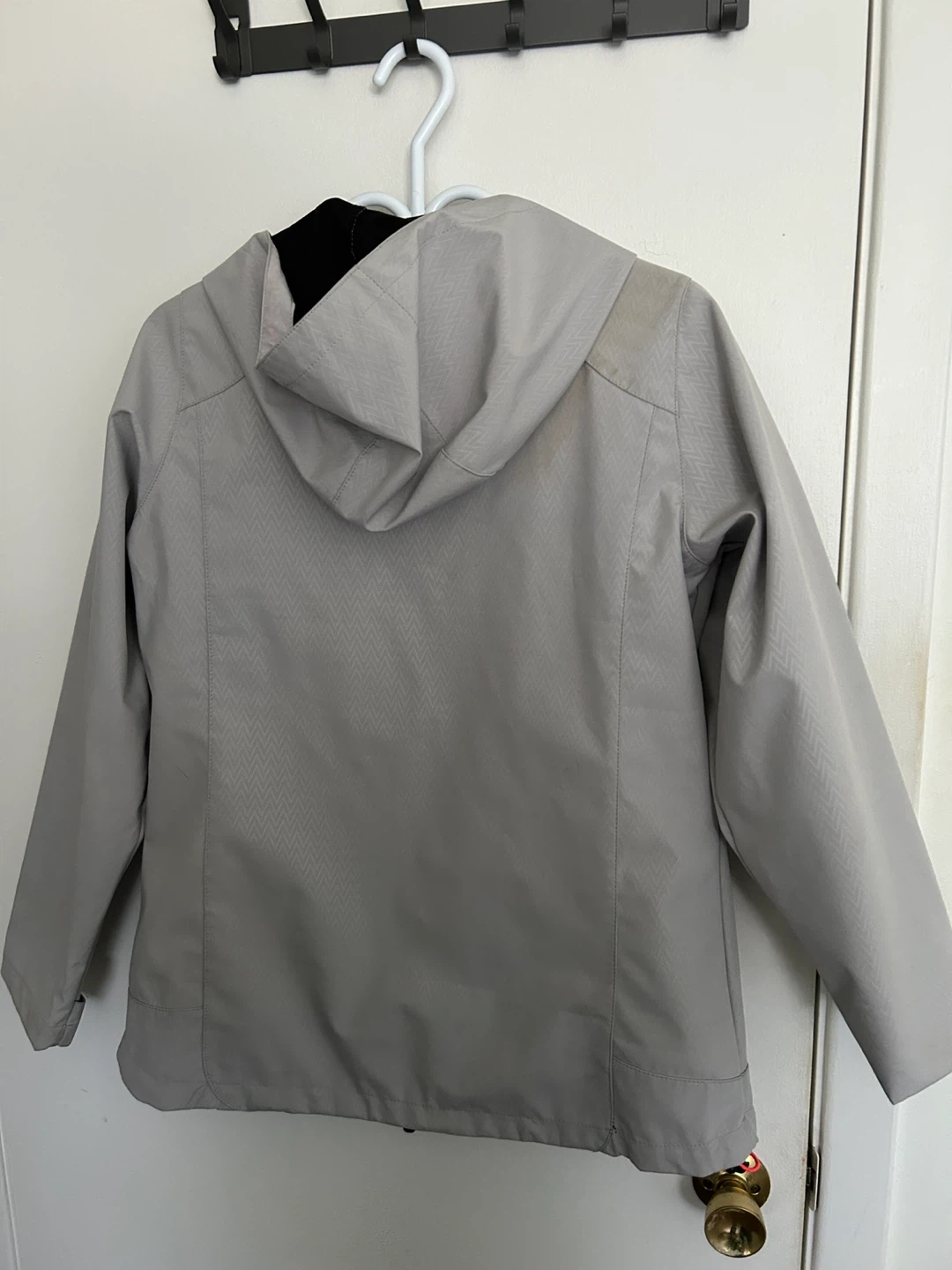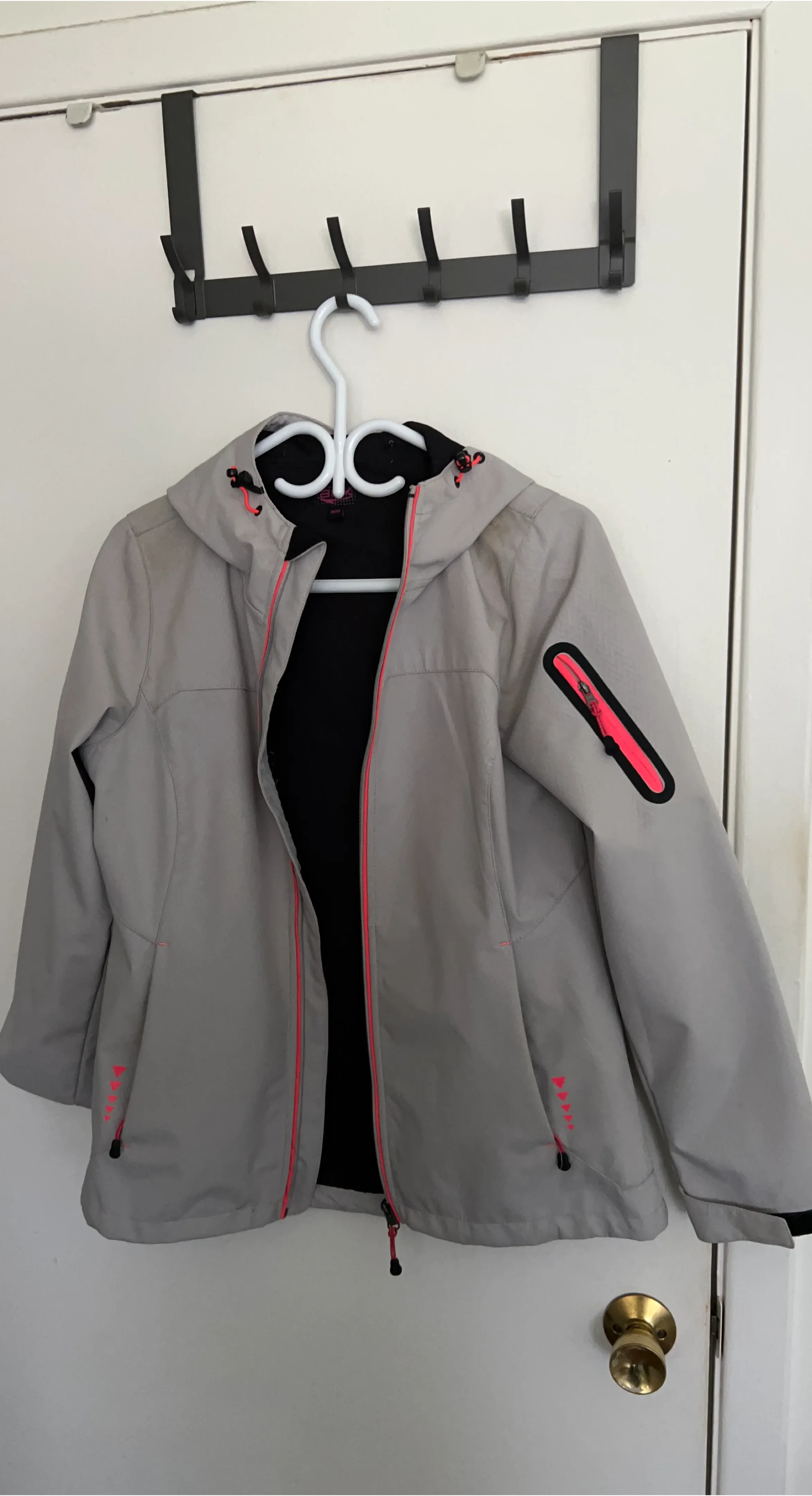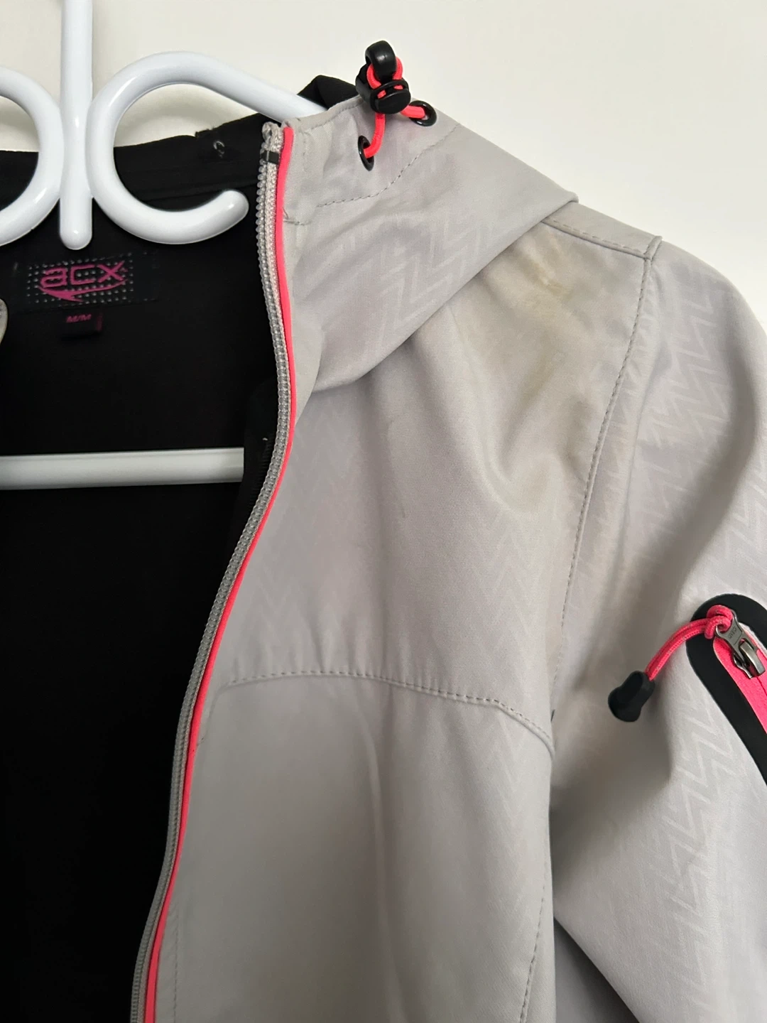 This ACX soft shell jacket is a size medium and features a light grey colour with pink accents. It's great for outdoor activities.