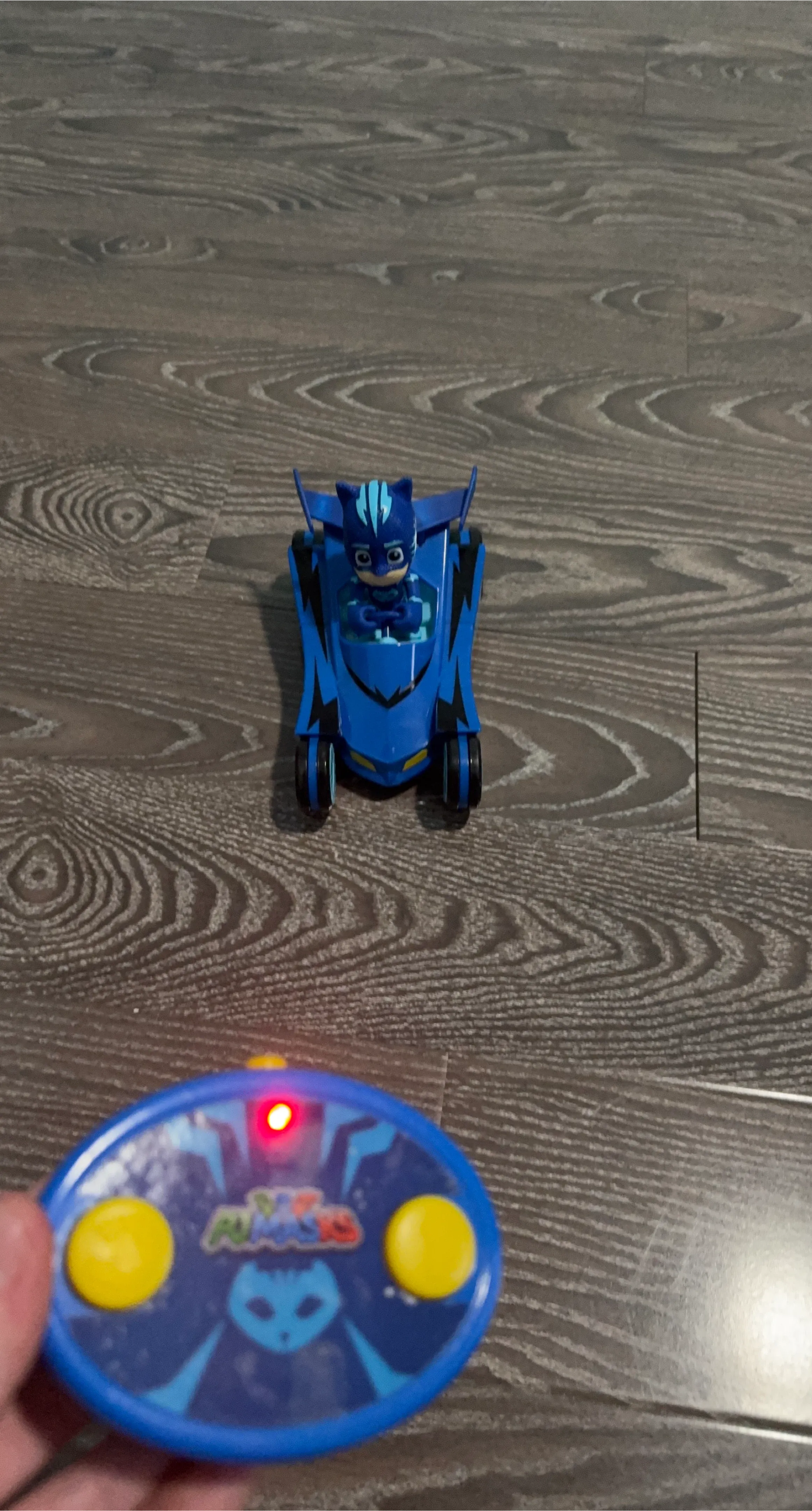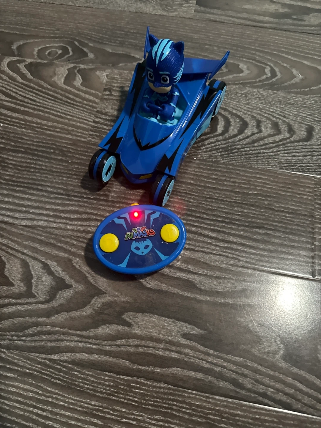 PJ Masks remote control Cat-Car with a Catboy figure. The remote has yellow buttons and a red indicator light. It's a fun toy for little fans of the show!