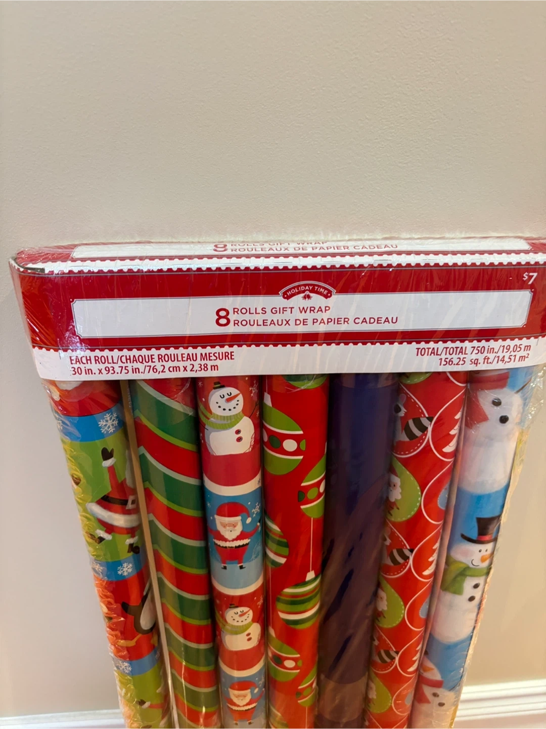 This package includes 8 rolls of holiday gift wrap. New and unopened. Each roll measures 30 in. x 93.75 in. The total is 750 sq. ft. of wrapping paper.