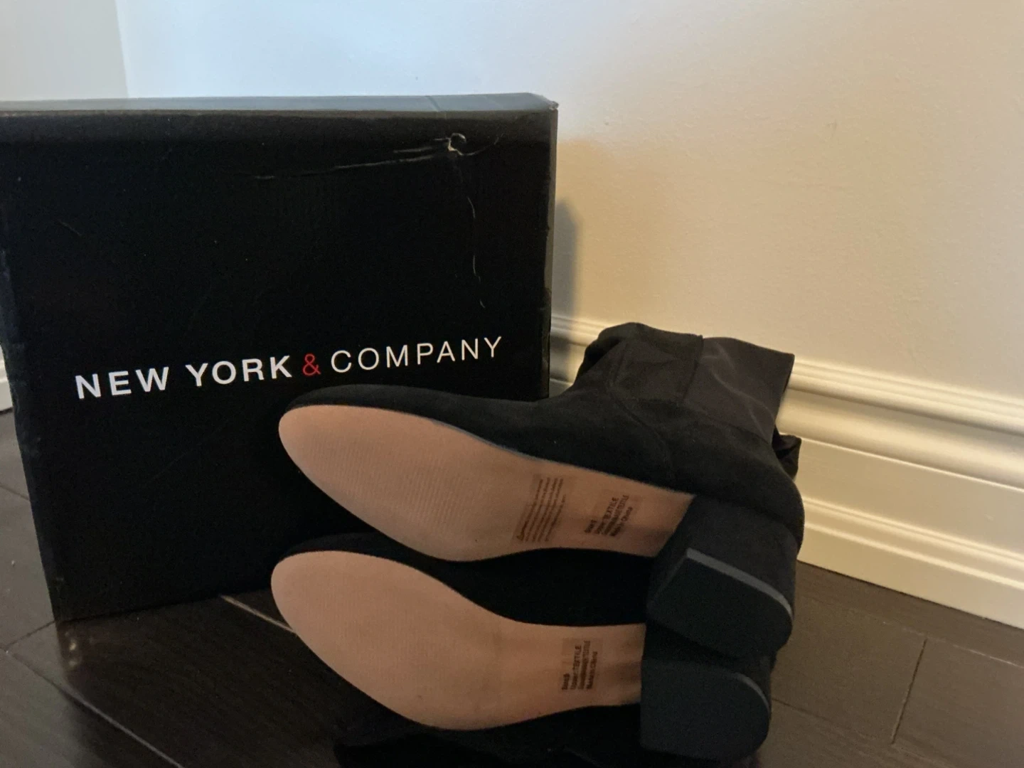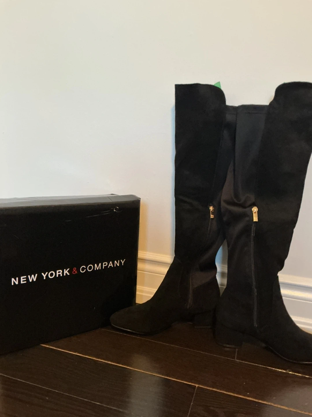 These black suede boots from New York & Company are a stylish addition to any wardrobe. They feature a side zipper for easy on and off. Includes original box.