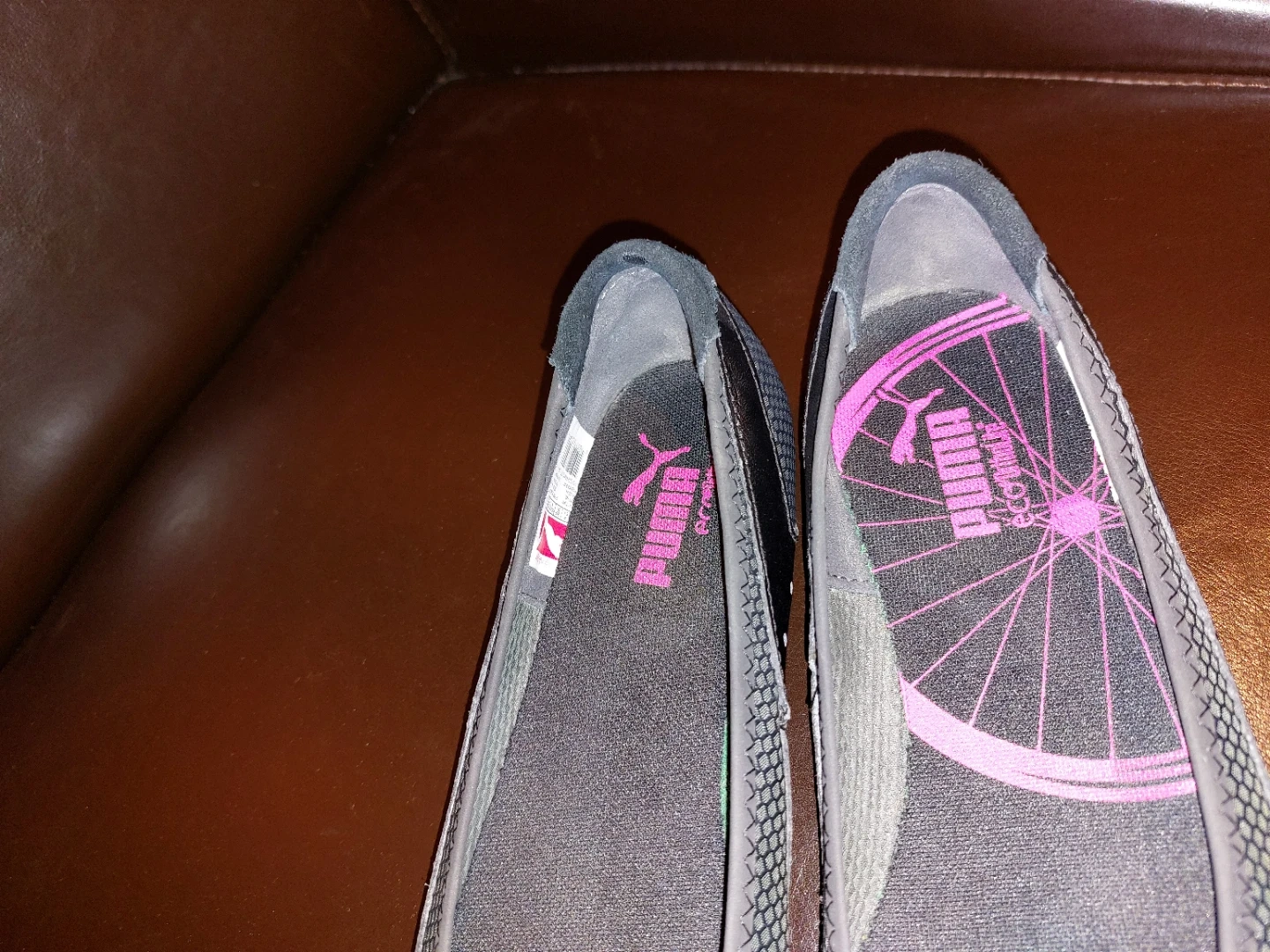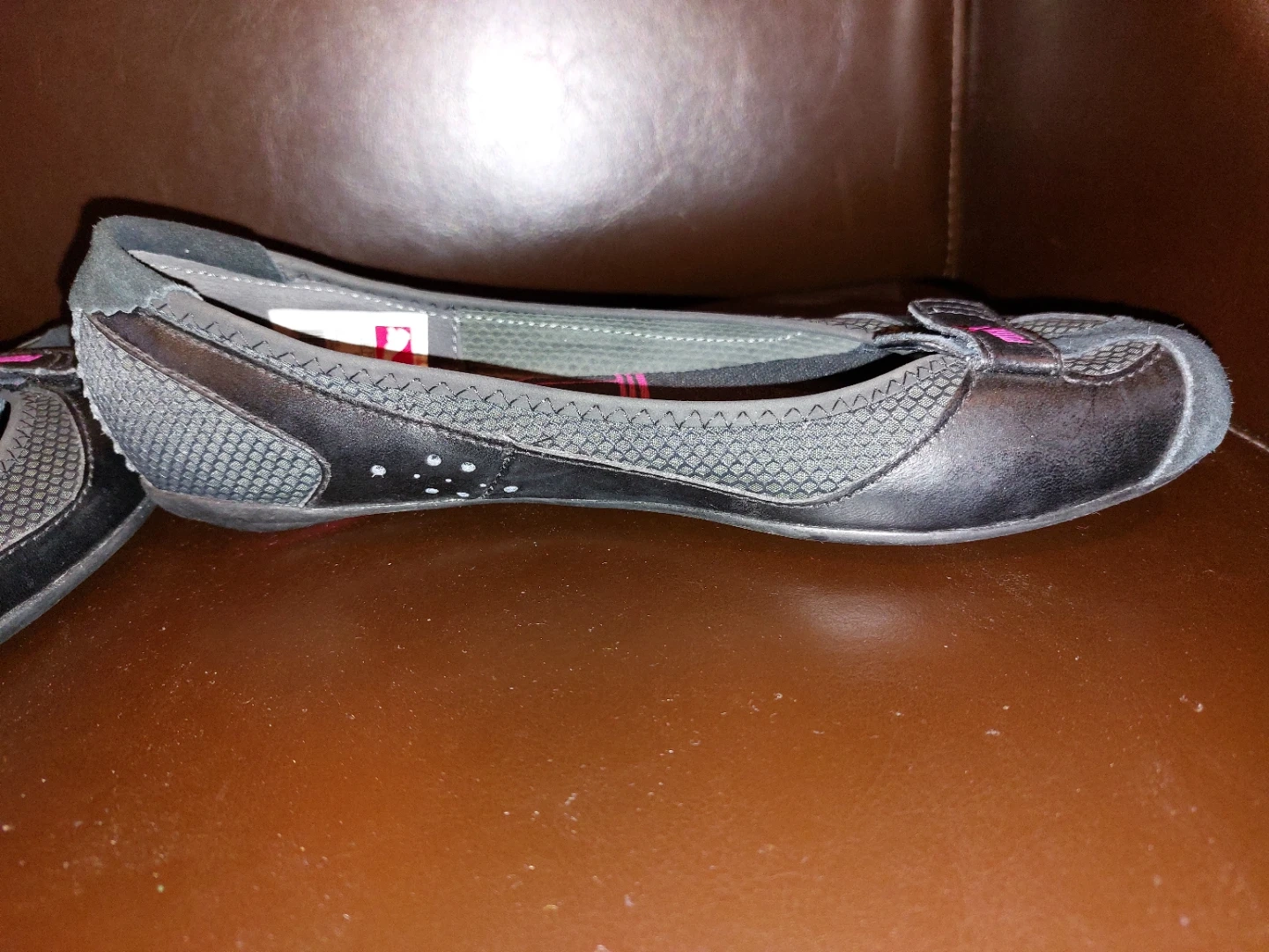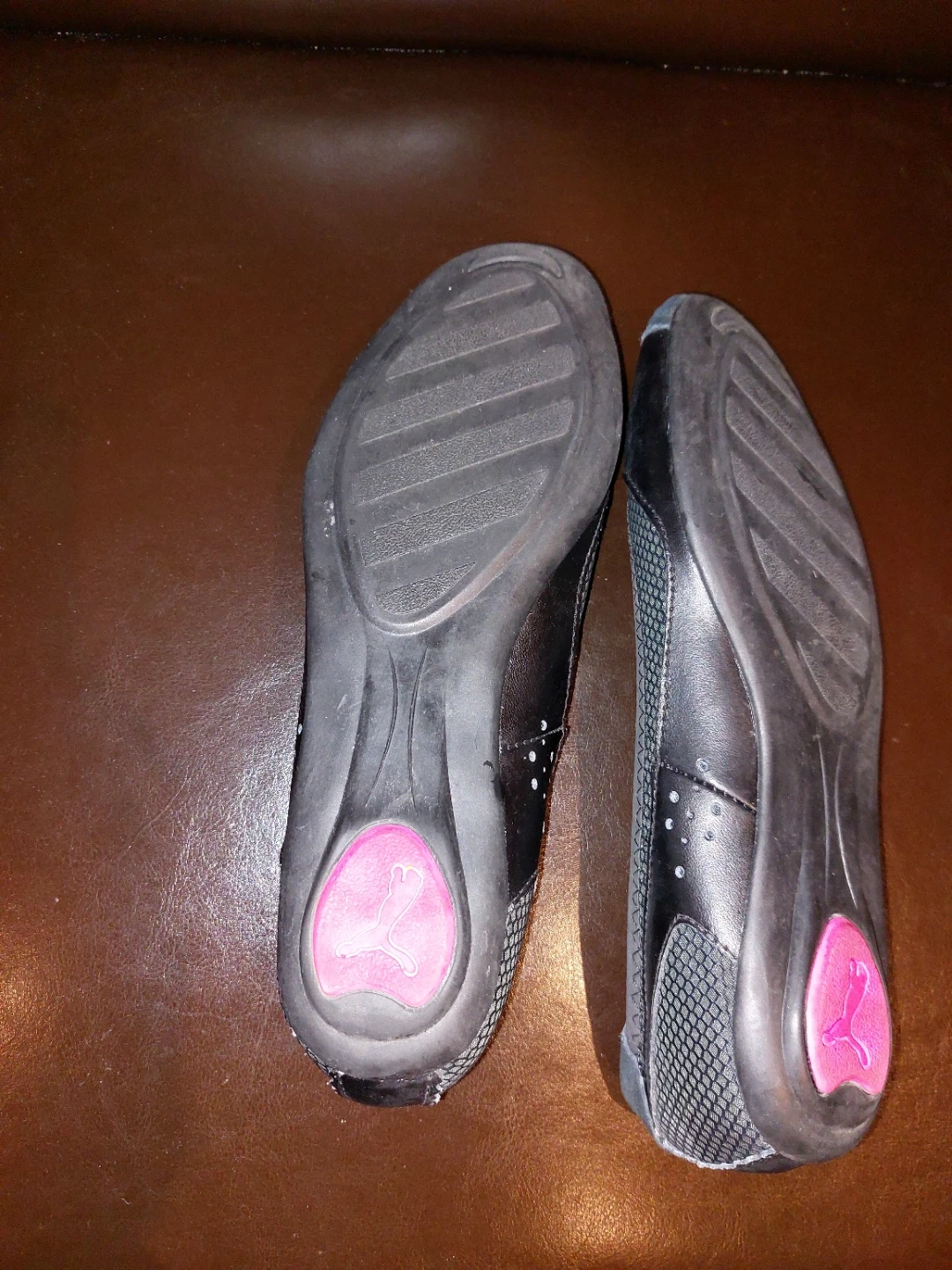 These Puma ballet flats are black with pink accents. They feature a mesh and real suede upper with a rubber sole. Comfortable and stylish for everyday wear! Size 8 women like new and memory foam sole very comfortable, just too big for me.