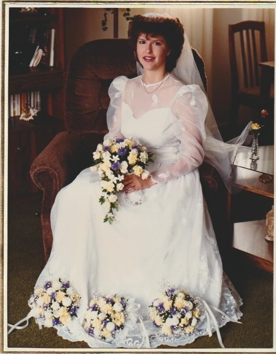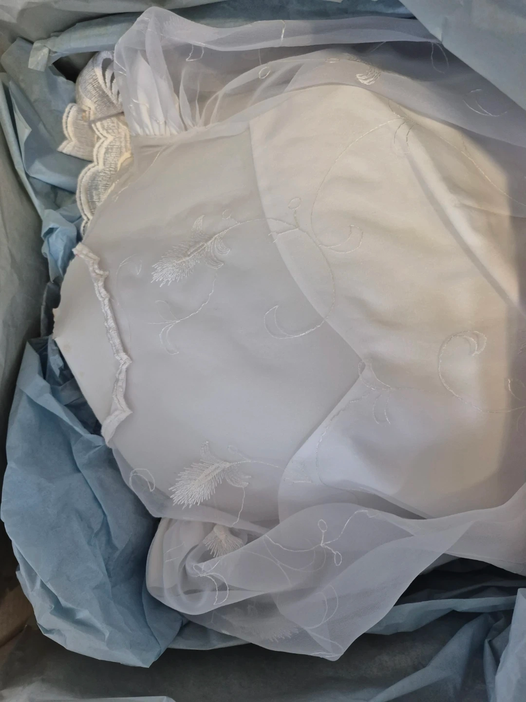 Dressmaker sewn. Taffeta and organza overlay. Sweetheart neckline. Stored in box and like new. Head piece and veil included. A photo of me wearing it is included to give an idea of the style. It was probably close to size 10 or 12.