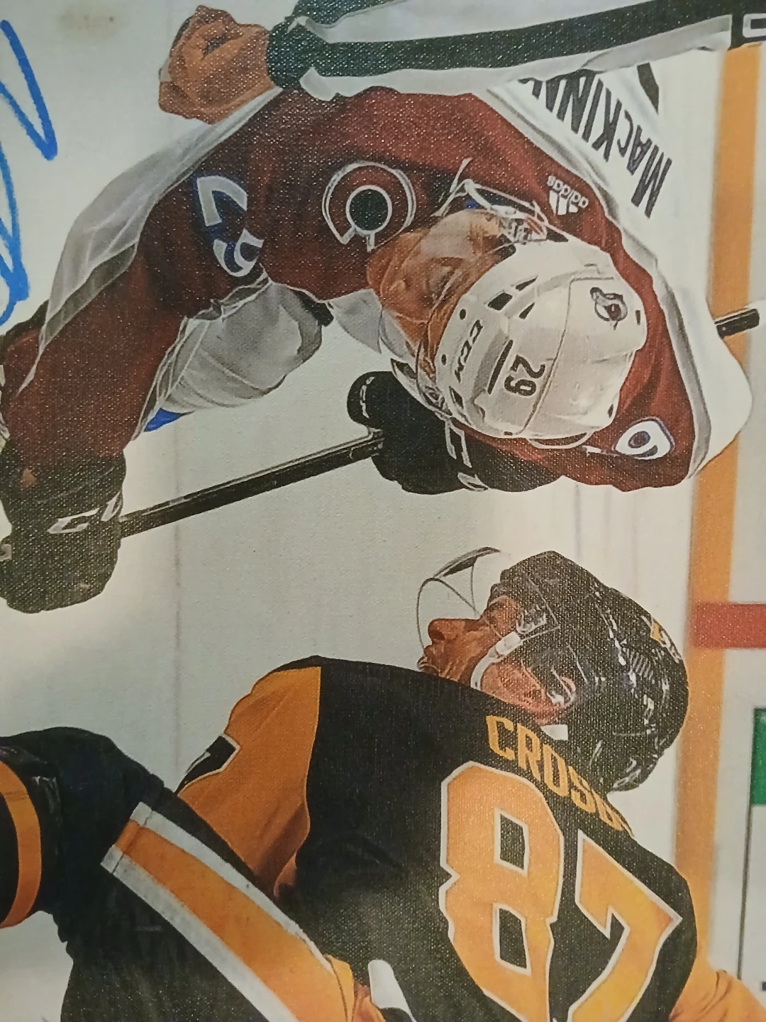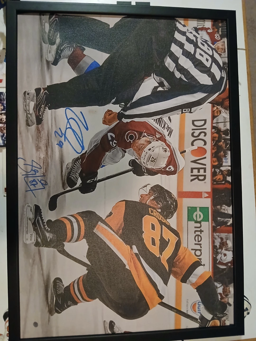 This is a framed canvas print of an NHL hockey face-off, featuring players Nathan MacKinnon and Sidney Crosby. It has been signed by both players in the original and then duplicated to the canvas print . Great for any hockey fan's collection! Reason for selling was able to obtain the original no need for both.