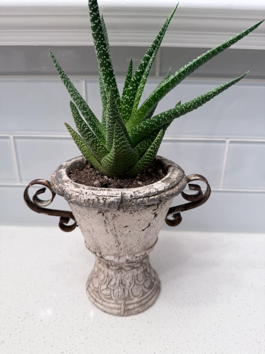 Selling a lovely potted Haworthia plant! This little succulent is easy to care for and adds a touch of green to any space. The pot has a vintage-inspired design with decorative handles, giving it a unique look