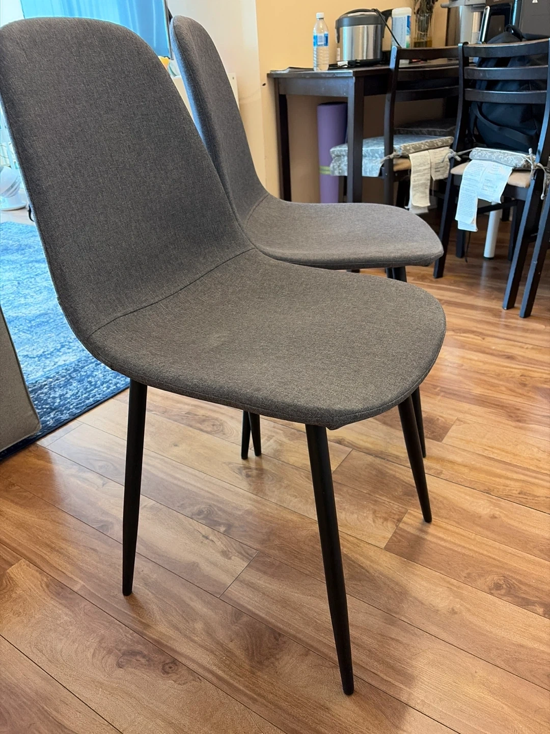 Selling a set of two grey dining chairs! They're in great condition and would look great in any dining room or kitchen. The chairs have a sleek, modern design with dark legs and a comfortable upholstered seat.