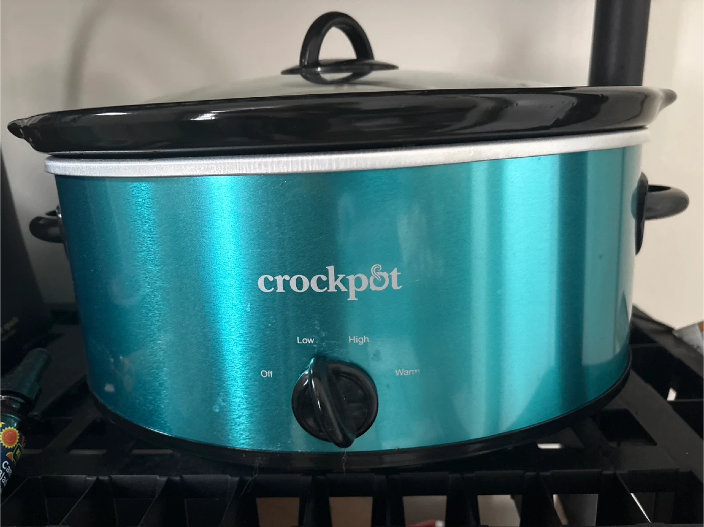 Selling a used Crockpot slow cooker in blue. It has a low, high, and warm setting, perfect for making soups or stews. The inside shows some signs of use, but it still works perfectly.