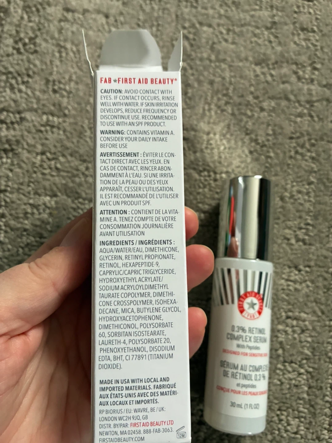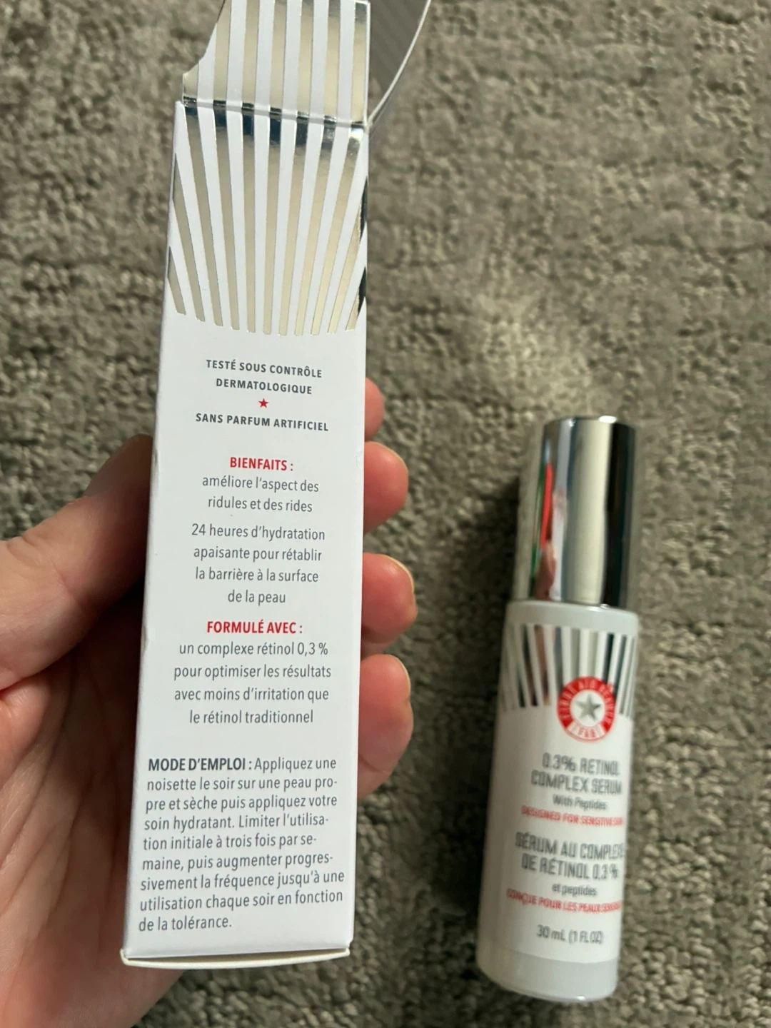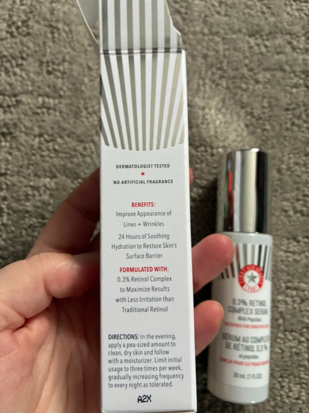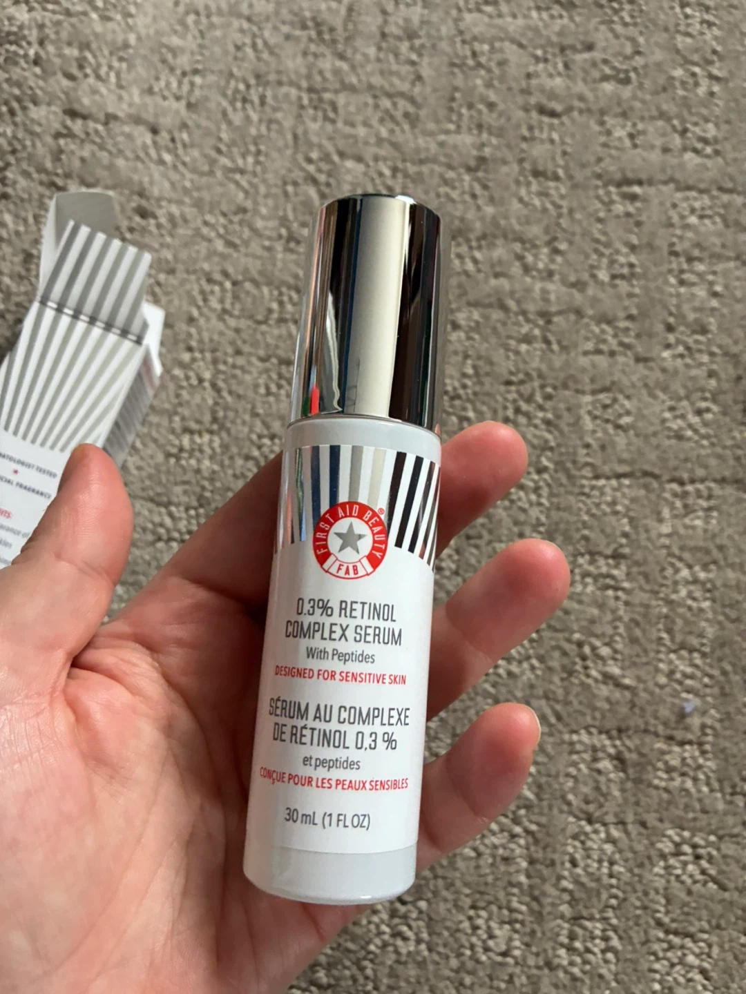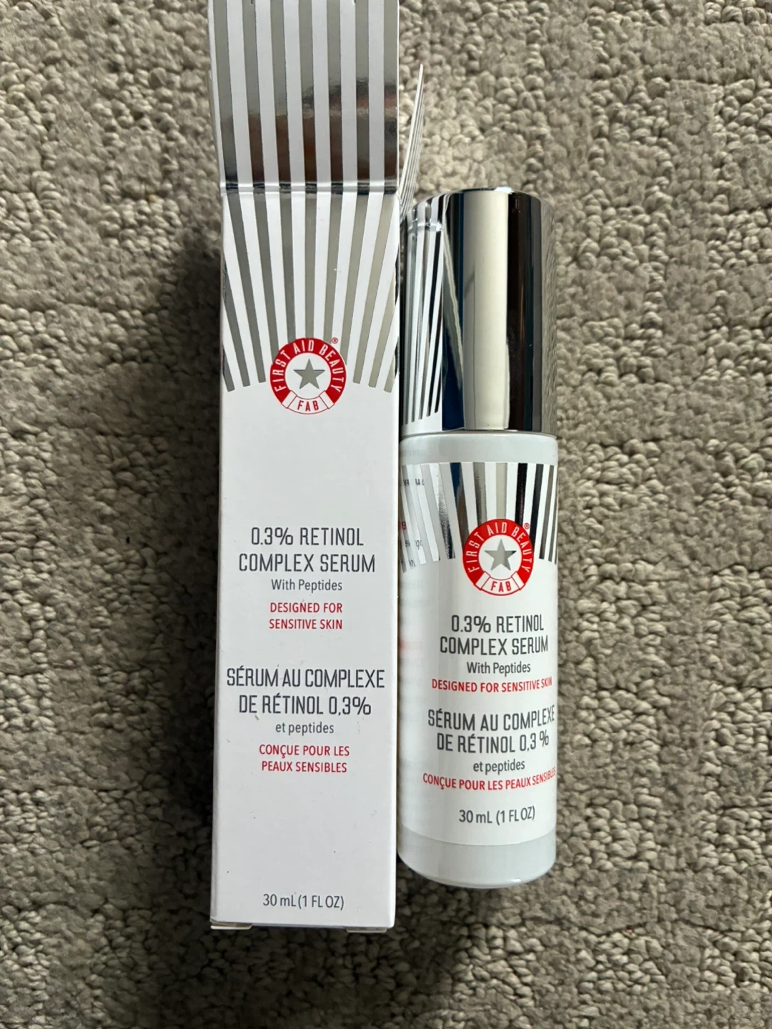 This First Aid Beauty serum is formulated with 0.3% Retinol Complex and peptides. It's designed for sensitive skin. The bottle contains 30 ml (1 fl oz).