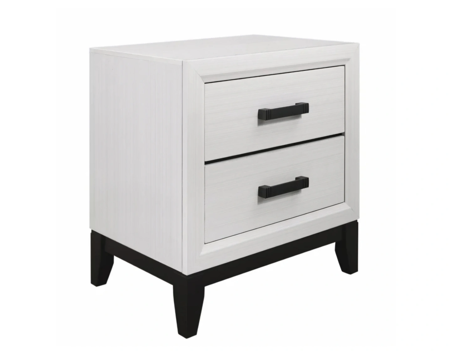 Modern nightstand. Two drawers. White finish with black legs and hardware. Simple design. Great for bedrooms. $125 each
