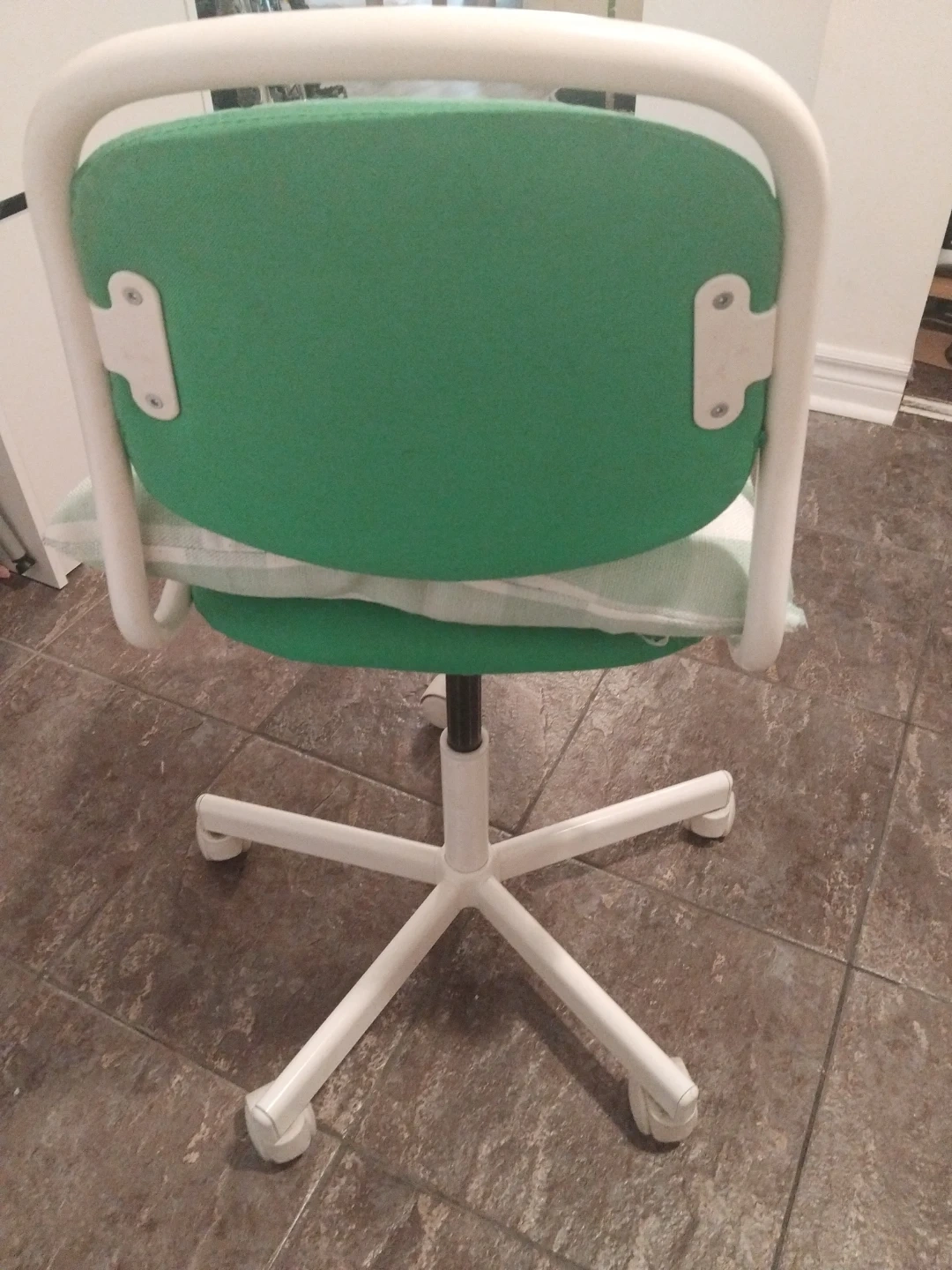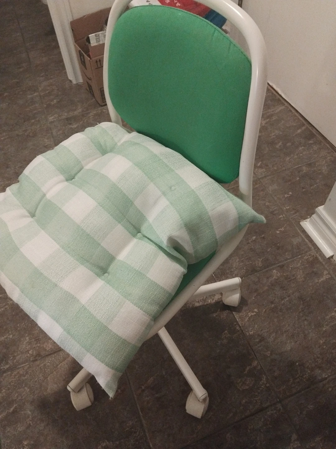 This is a green office chair with a white frame. It has a padded seat and back. A green and white checkered cushion is included, but it's not the cleanest with little stains on it. It's a comfortable chair for a desk!