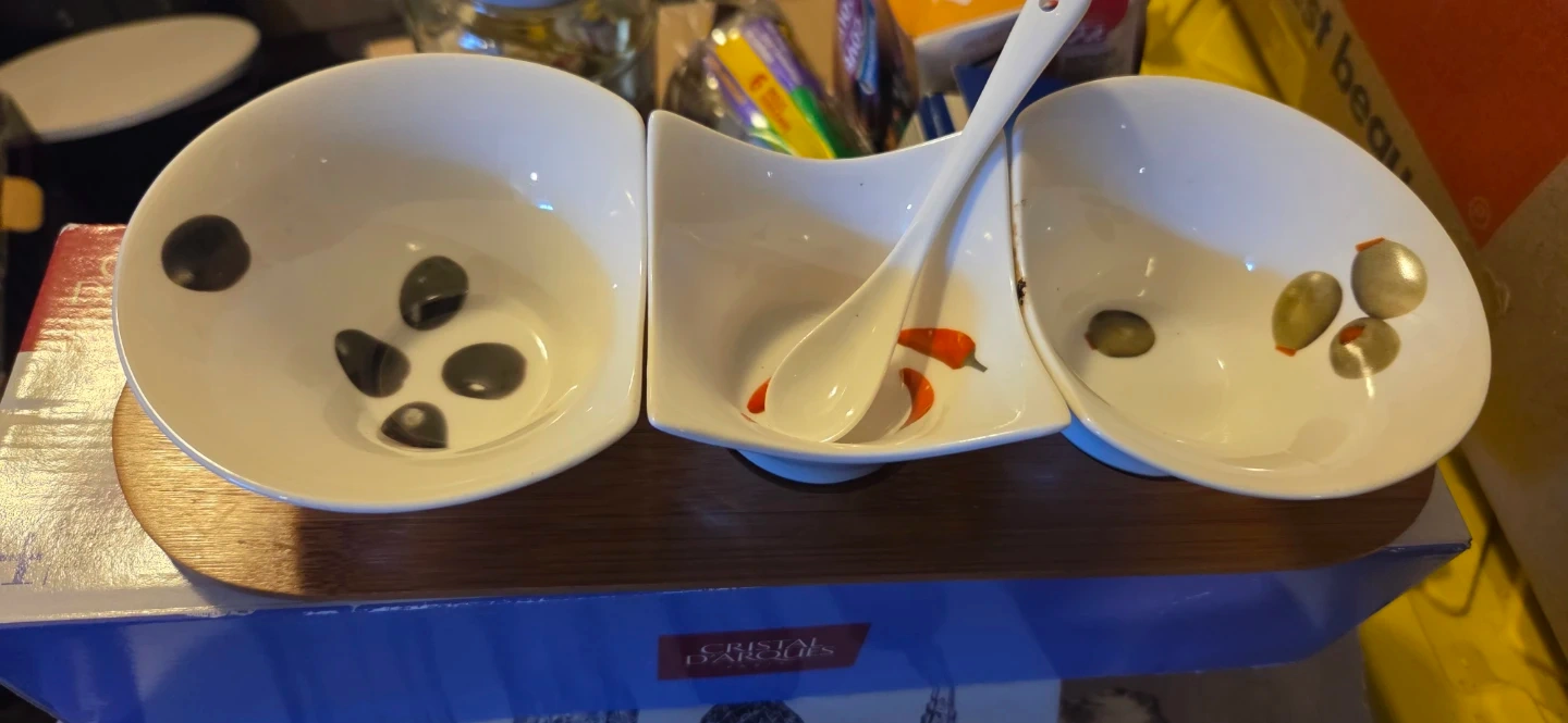 This set features three white ceramic bowls on a wooden base, perfect for serving olives or other small appetizers. Two bowls are decorated with olive designs, and the centre bowl has chili pepper accents. It includes a serving spoon.