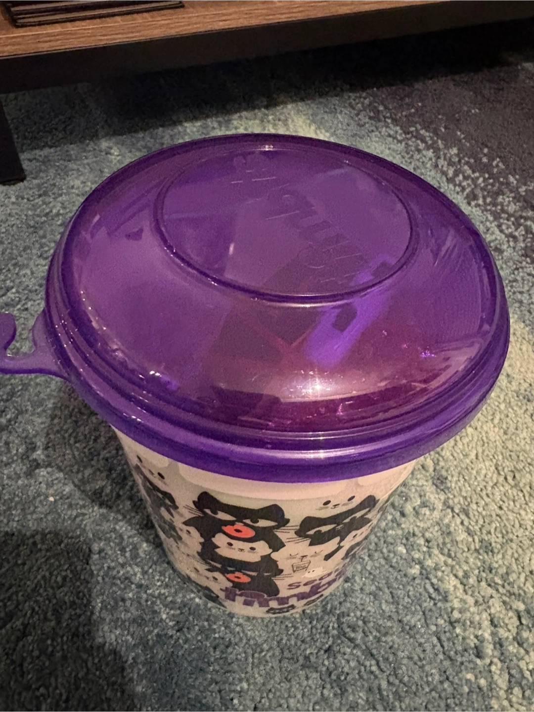 This Tim Hortons container features a fun Halloween cat design. It's made of translucent plastic with a purple lid. Perfect for collecting Halloween treats or for general storage!
