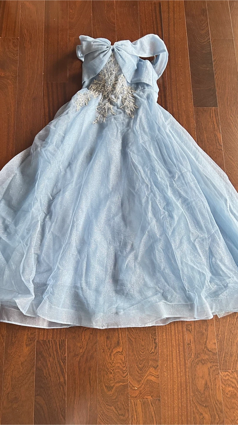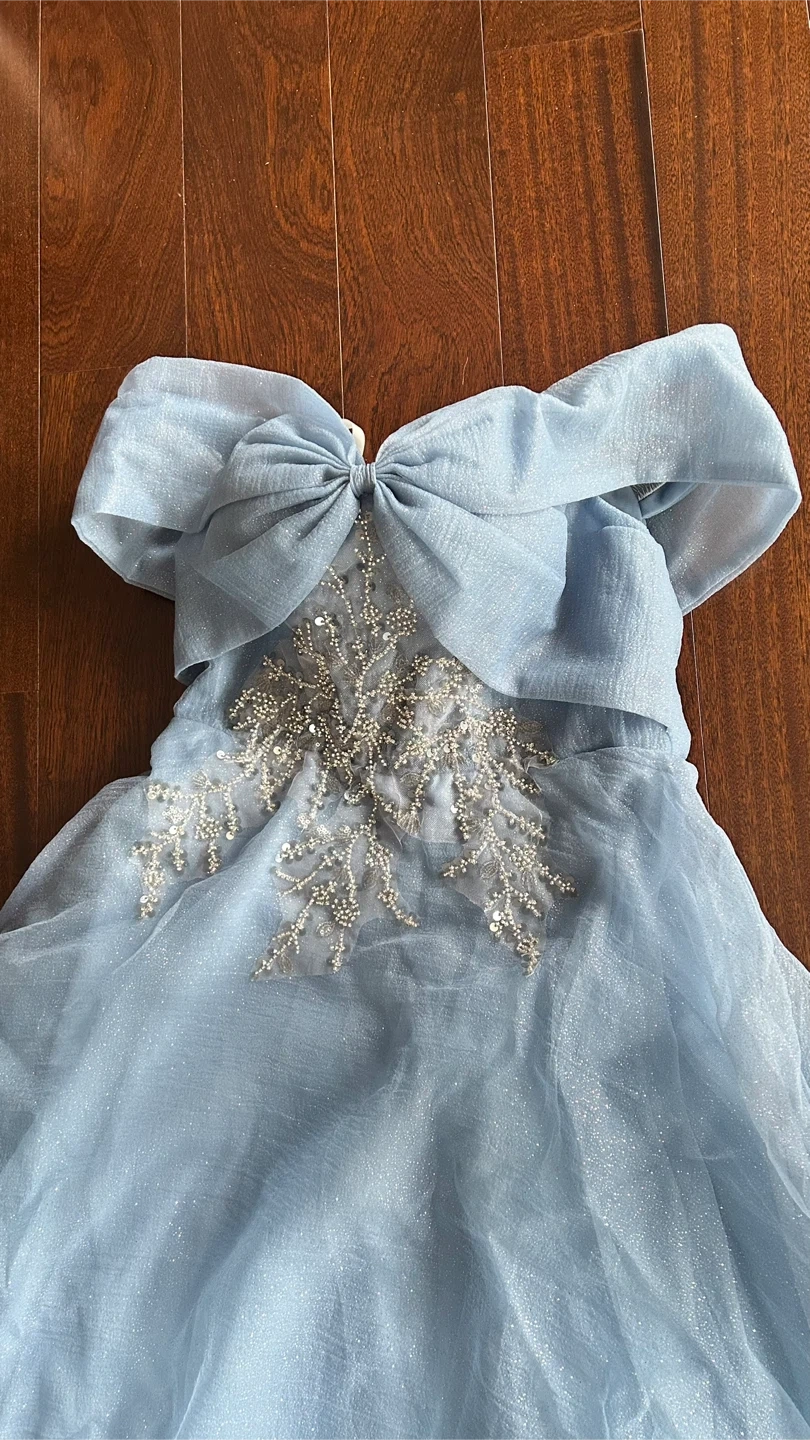 Beautiful light blue off-the-shoulder gown with delicate beading on the bodice. It features a sparkly tulle overlay and a lace-up back for a custom fit. This dress is perfect for formal events!