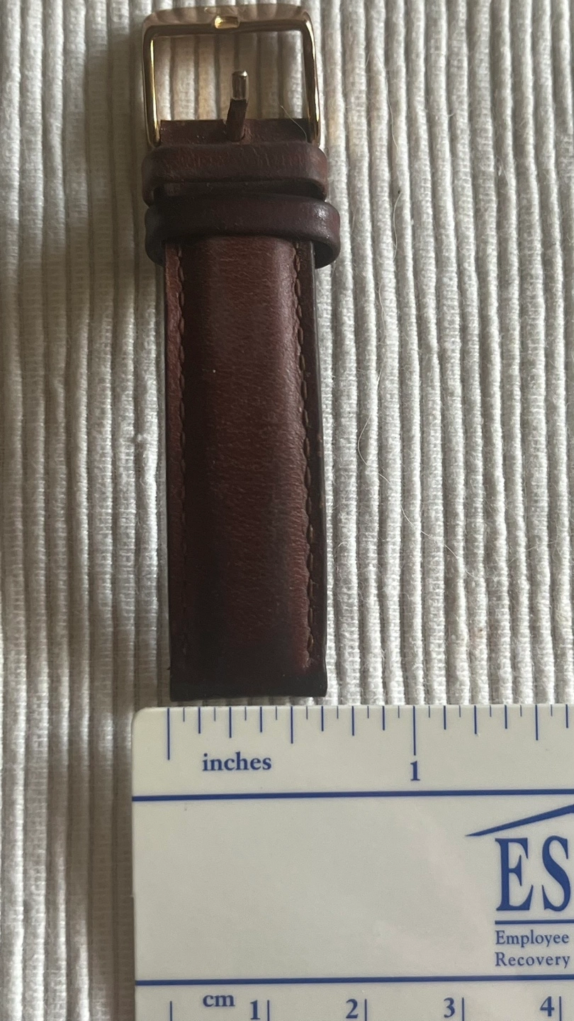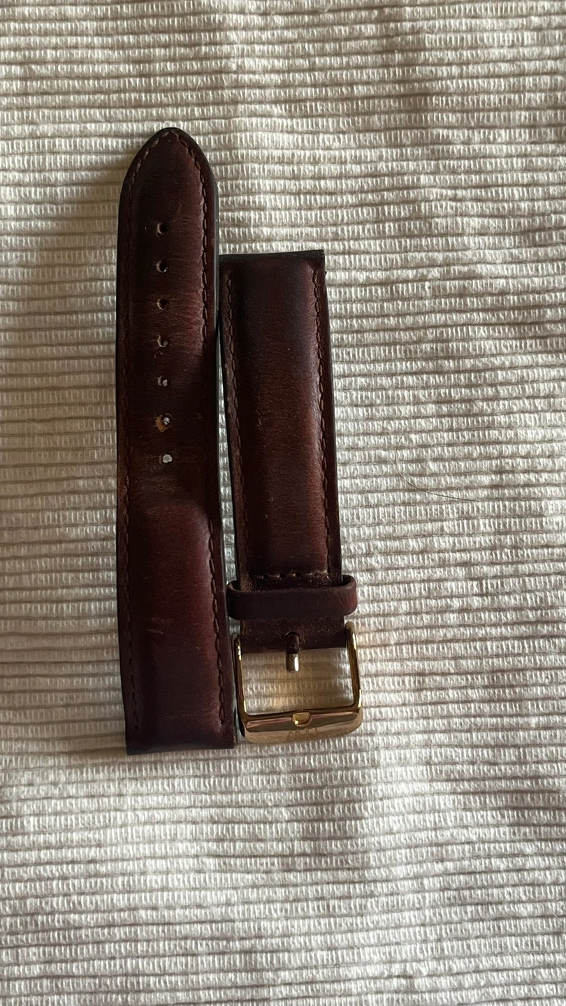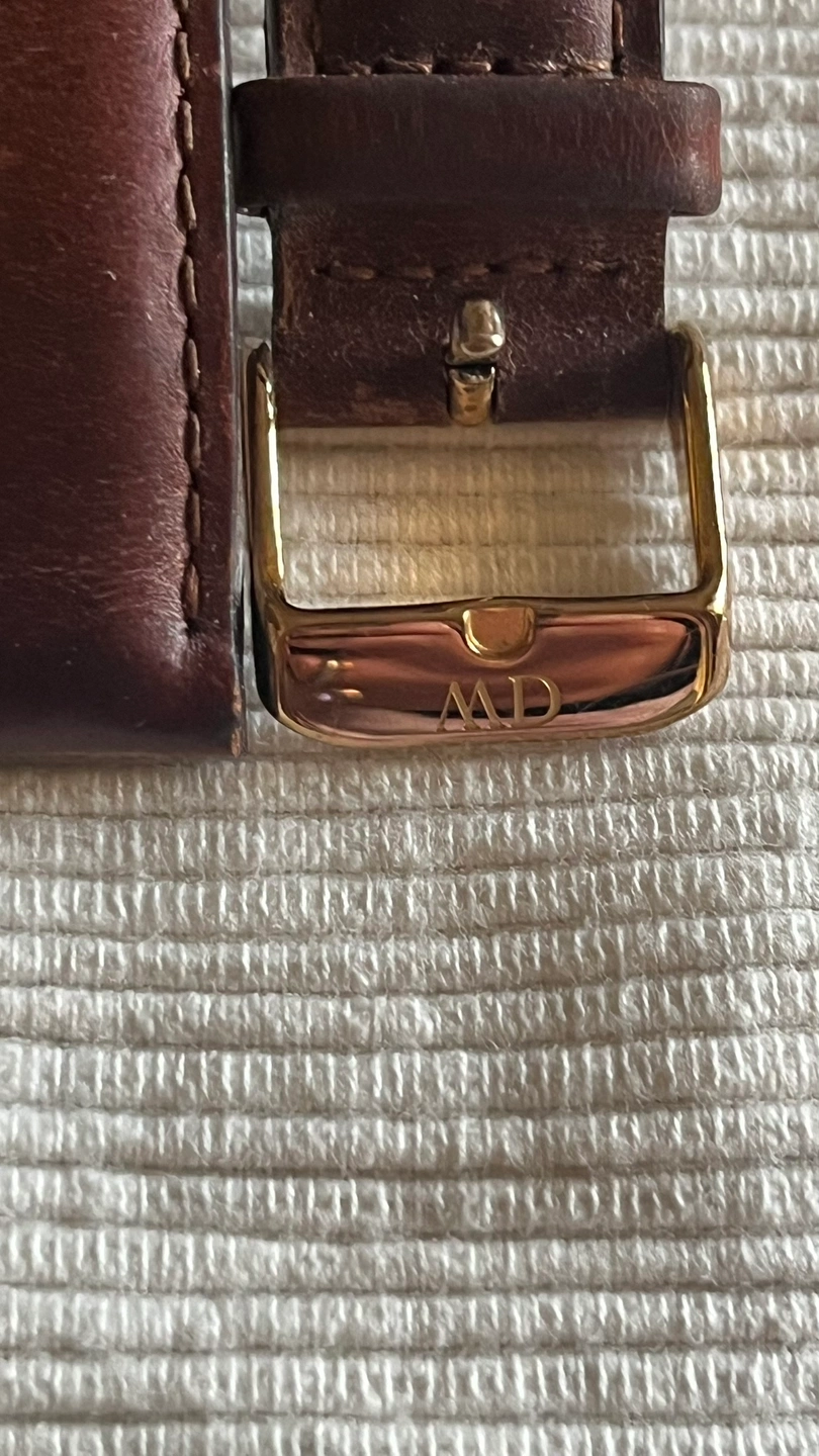 A brown leather watch strap with a gold buckle and clasp. The buckle is engraved with "DW”