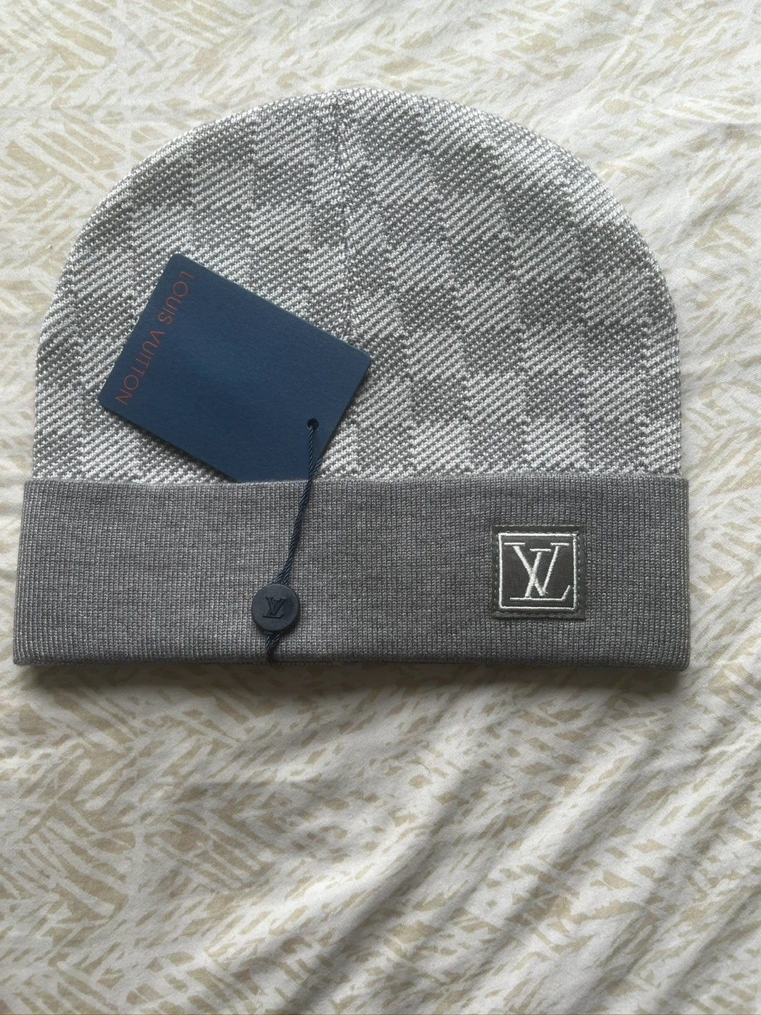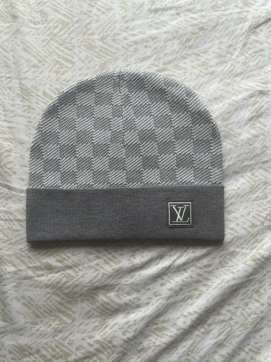 Selling a Louis Vuitton beanie in grey. It's in great condition and ready to keep you warm this winter. Features the classic LV logo and a stylish checkered pattern. Perfect for adding a touch of luxury to your everyday look!