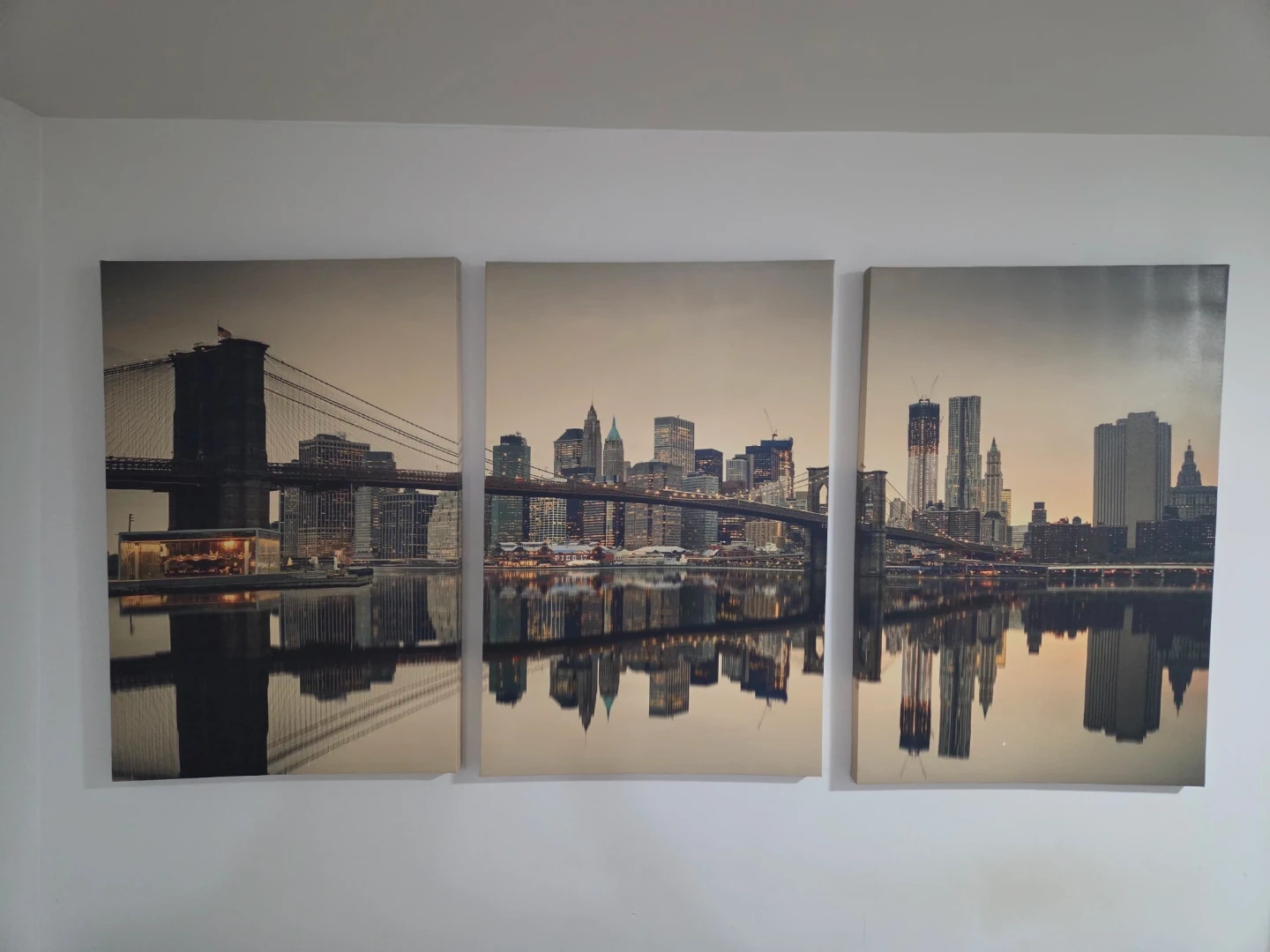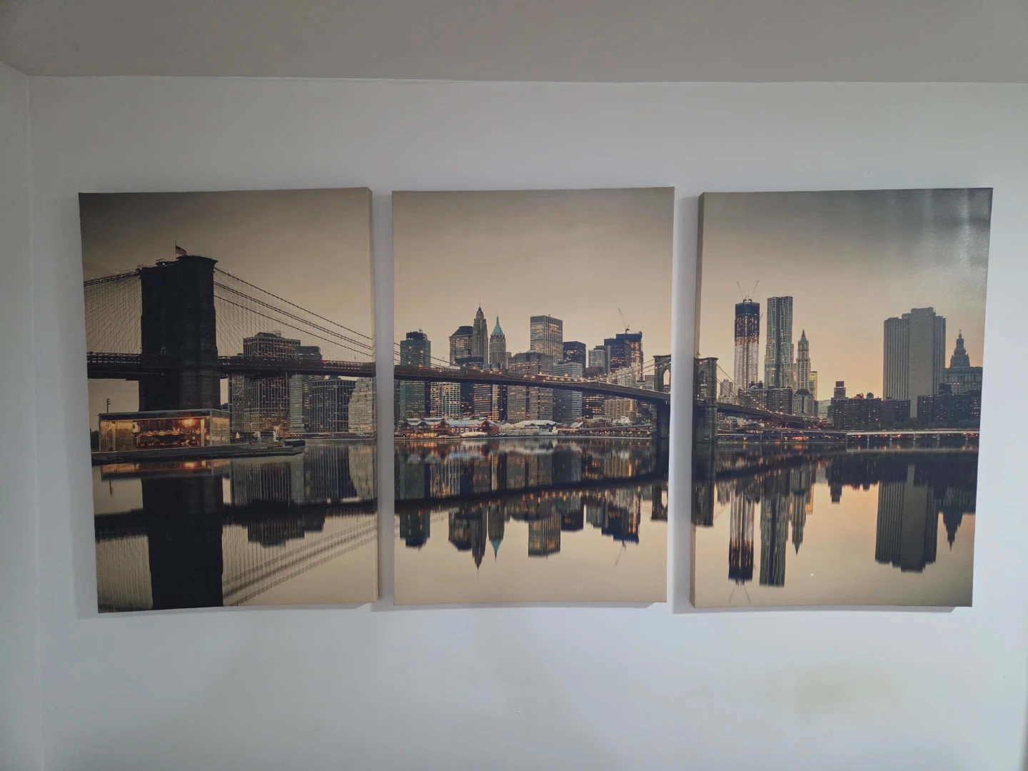 Beautiful 3-piece wall art (triptych) featuring a stunning view of the Brooklyn Bridge and the skyline of New York City at sunset.