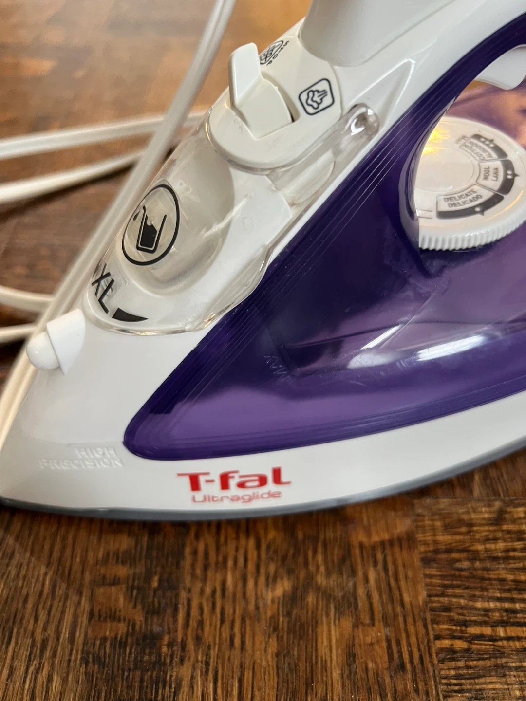 This T-fal Ultraglide iron has a purple and white design. It's suitable for various fabric settings. A handy iron for everyday use!